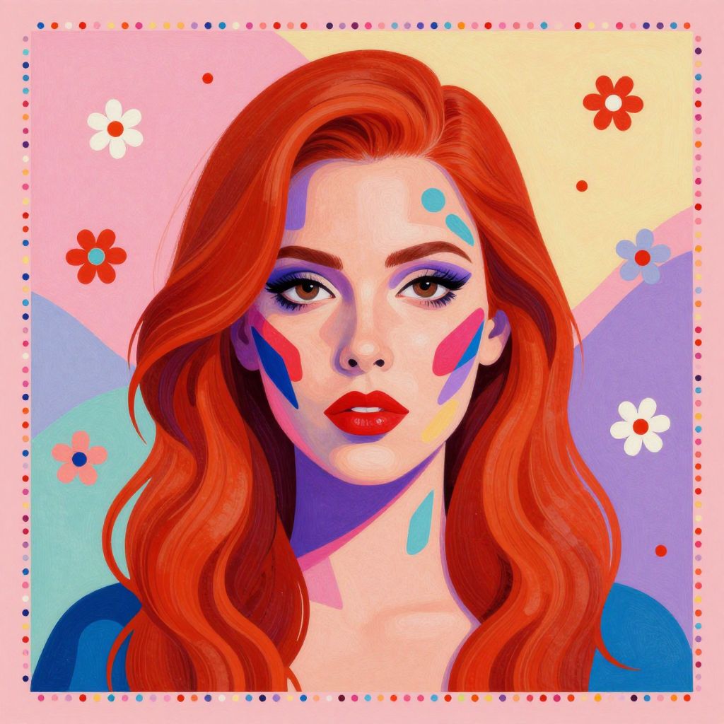 The image depicts a striking portrait of a woman with vibrant red hair cascading down her shoulders. Her face is adorned with a delicate, abstract pattern of colorful, geometric shapes, predominantly in shades of red, purple, and blue. The background is a harmonious blend of soft, pastel hues, featuring small, scattered flowers that add a touch of whimsy to the composition. The overall style is reminiscent of pop art, with bold, contrasting colors and a playful, dynamic feel. The interplay of shapes and colors creates a sense of depth and movement, drawing the viewer's eye across the canvas. The portrait is framed by a series of small, colorful pointillism dots, adding texture and dimension to the artwork. The composition is balanced, with the woman's face centrally positioned, surrounded by the intricate patterns and floral elements, creating a visually engaging and harmonious piece.