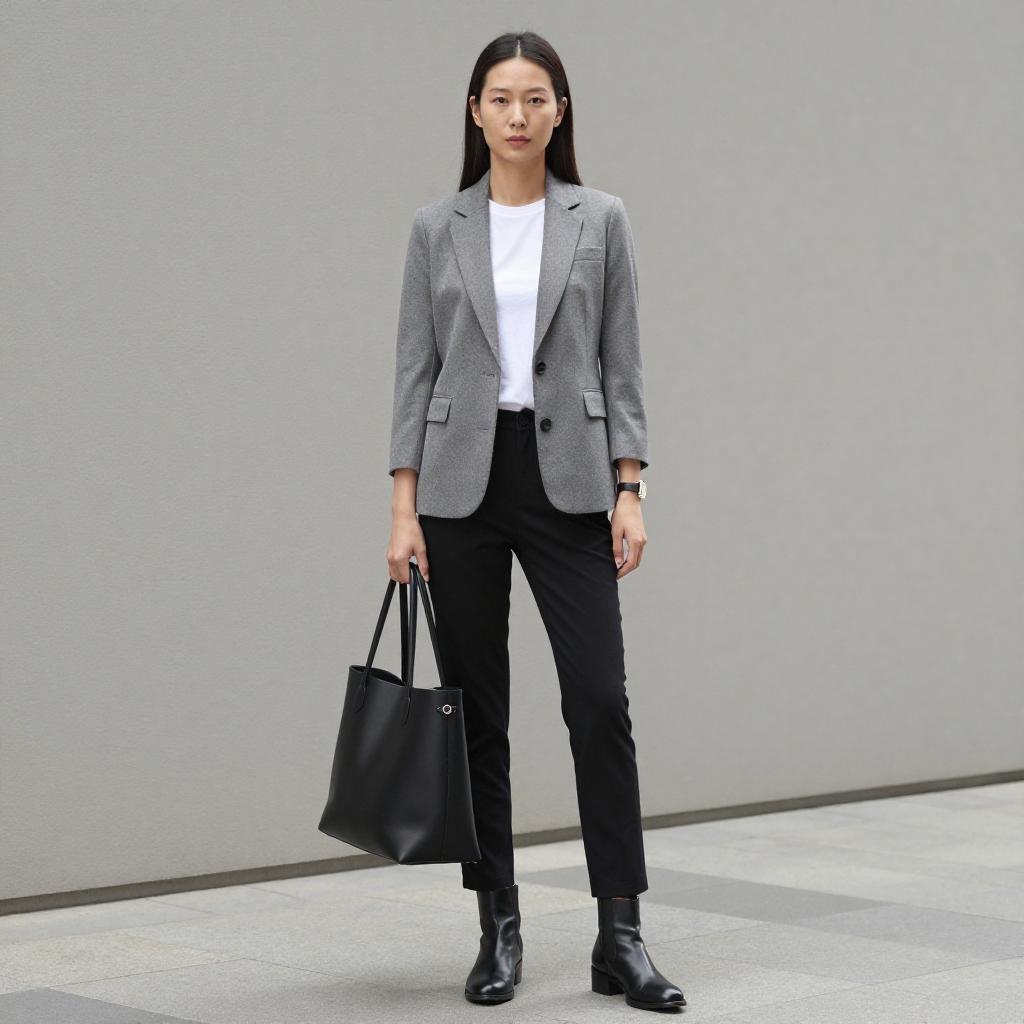 Photograph of a woman walking in profile on a city sidewalk. She's wearing a long, tan, wool coat with a belt, blue jeans, and black boots with gold buckles. She has dark hair tied back and is carrying a brown leather crossbody bag. The background features a beige building with a black iron gate and a potted bush. The sidewalk is made of light gray bricks.