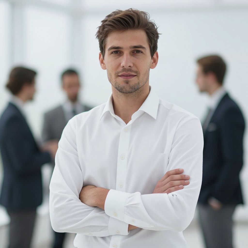Photograph of a confident, attractive Caucasian man in his 30s with short, dark brown hair and light stubble. He wears a crisp, white button-down shirt with sleeves rolled up to his elbows, and stands with arms crossed. His expression is neutral with a slight smile. In the blurred background, three other men in dark business suits are engaged in conversation. The setting appears to be a bright, modern office with a white, minimalist aesthetic. The man in the foreground is sharply in focus, contrasting with the softly blurred background.