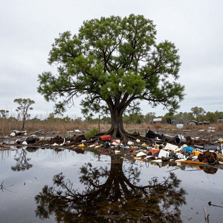 Photograph of a large, green-leaved tree standing in a muddy, trash-filled waterlogged area with reflections, under an overcast sky.
