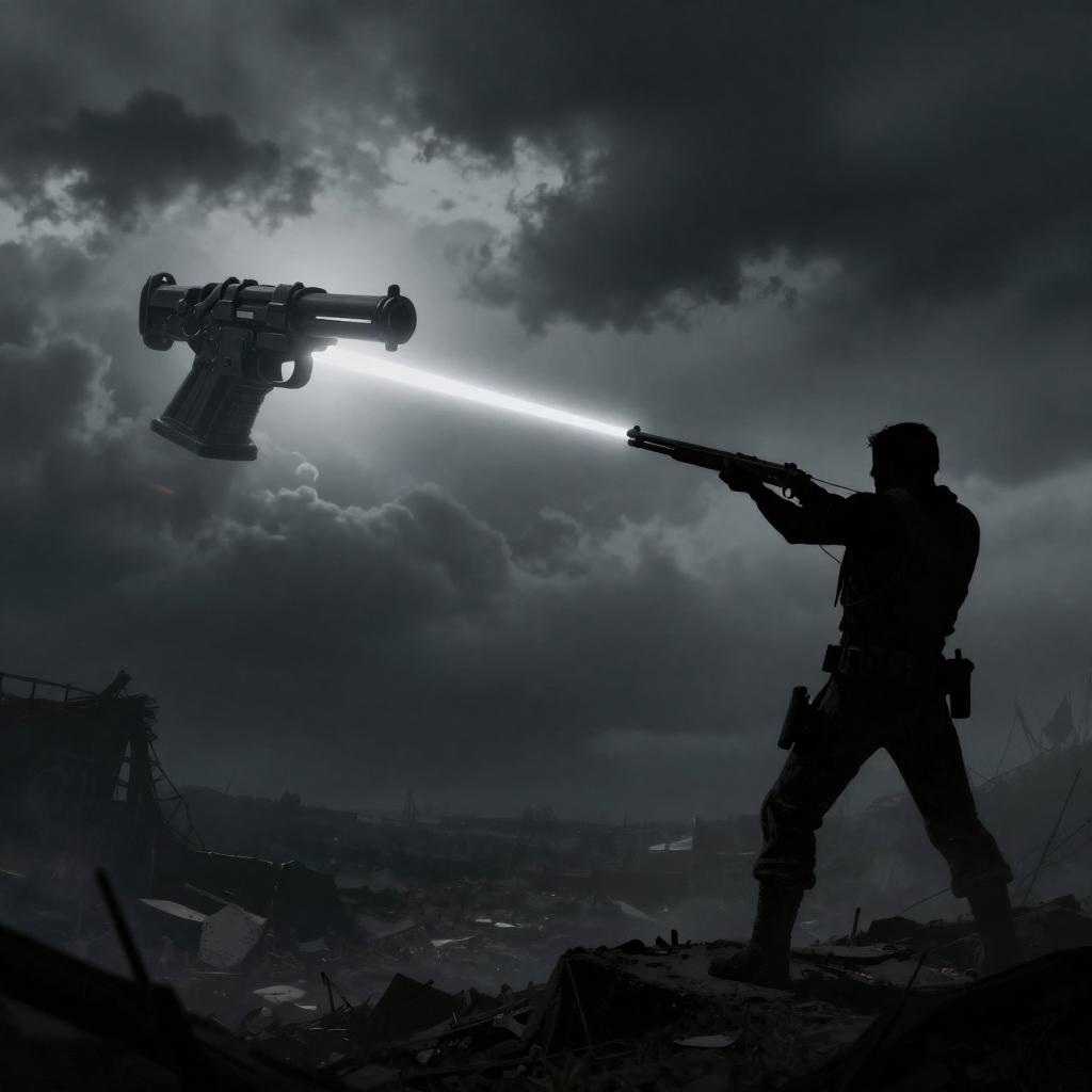 Digital artwork of a dark, post-apocalyptic scene. A silhouetted figure with a long gun pulls back on a string, aiming at a larger, floating gun-like object emitting bright white beams. The background features a cloudy, stormy sky and a ruined, rubble-strewn landscape. The figure stands to the right, while the floating object is on the left.
