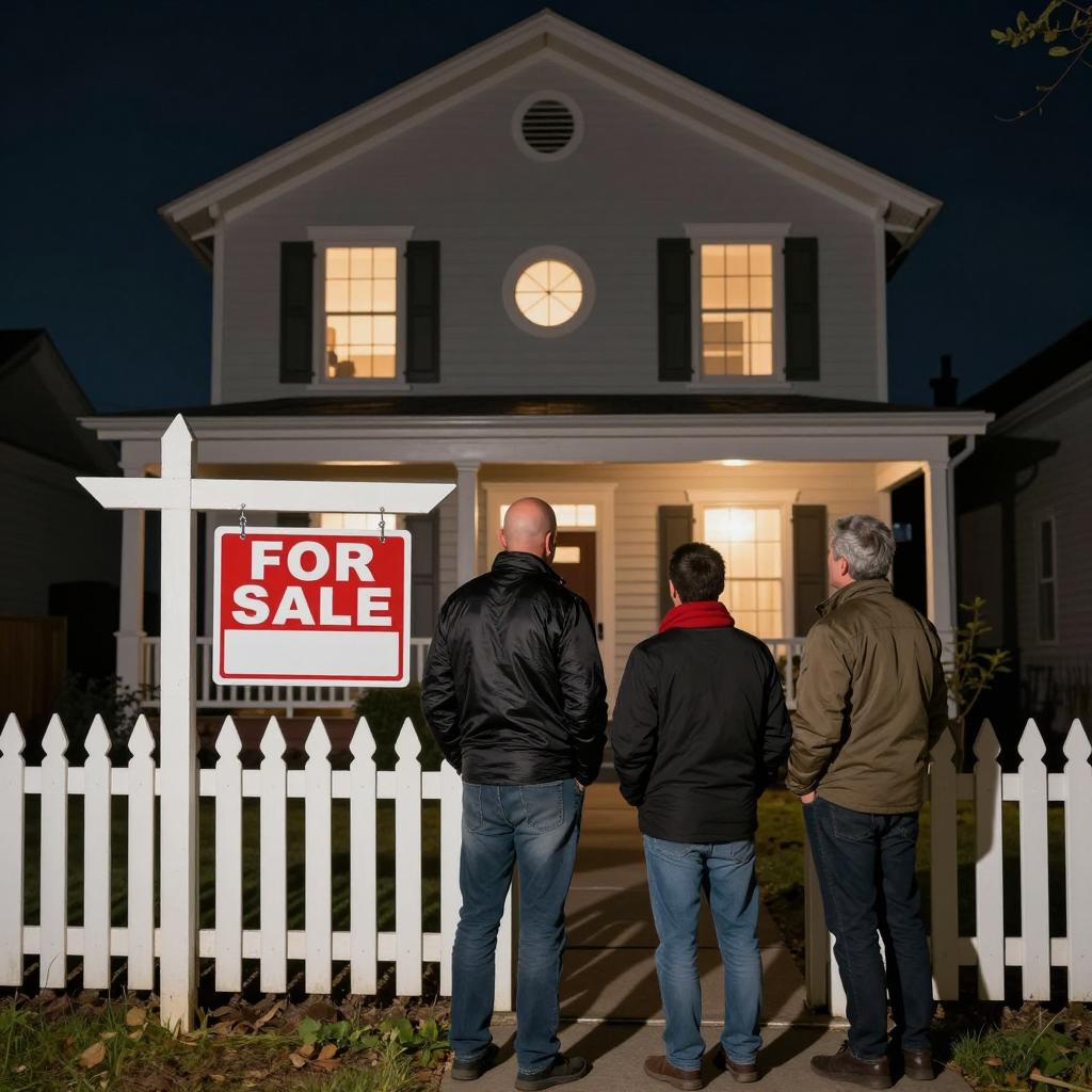Aerial nighttime image of a suburban residential neighborhood featuring neatly arranged houses with well-maintained lawns, illuminated sidewalks, streetlights, and tree-lined streets. The uniformity of the homes and the lighting highlights the organized street layout.