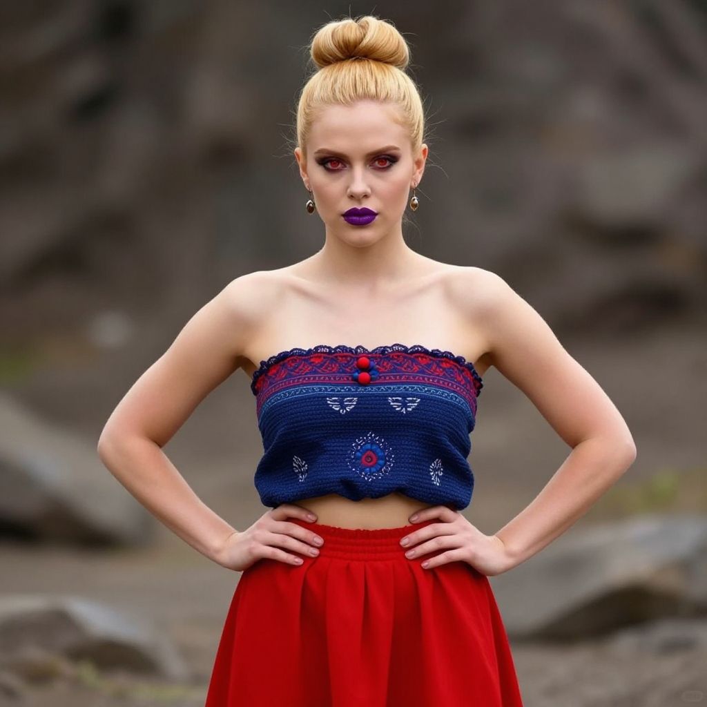 Photograph of a pale-skinned, blonde woman with her hair in a high bun, standing with hands on hips. She wears a strapless, blue knit top with red and white lace detailing, and a high-waisted, bright red skirt. Her makeup includes bold purple lipstick and dark eye makeup. The background is blurry, featuring dark, rocky terrain. The woman's confident pose and vibrant outfit contrast with the muted, natural surroundings. The image has a slightly overexposed, almost surreal quality, emphasizing the subject's striking appearance.