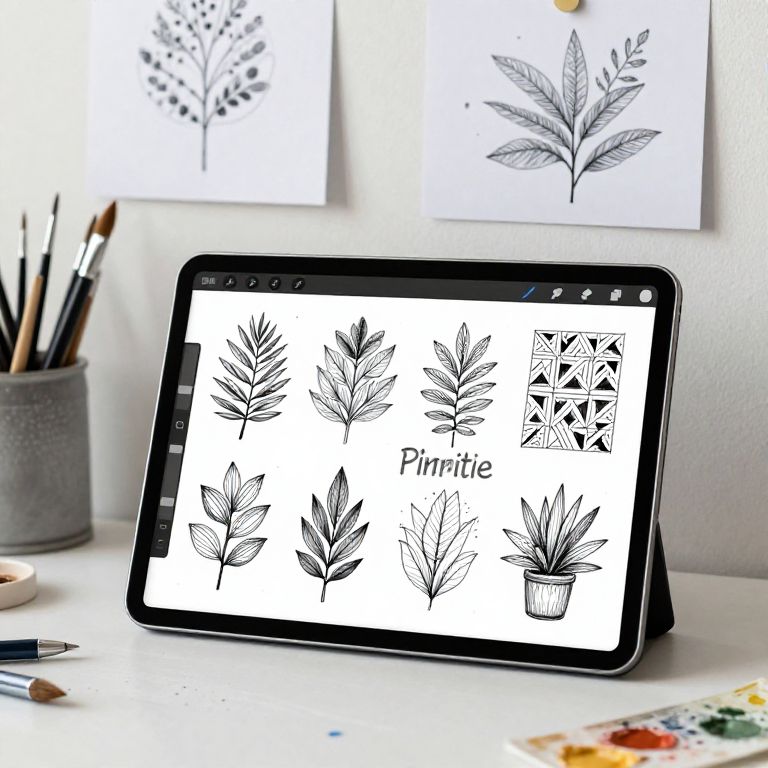 Drawing Pinterest concept featuring a digital tablet screen filled with layered sketches of botanical drawings and geometric patterns, alongside printed sketches pinned on a wall with washi tape, surrounded by brushes, pens, and paint splatters in a well-lit modern studio.