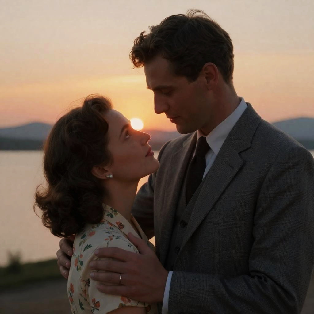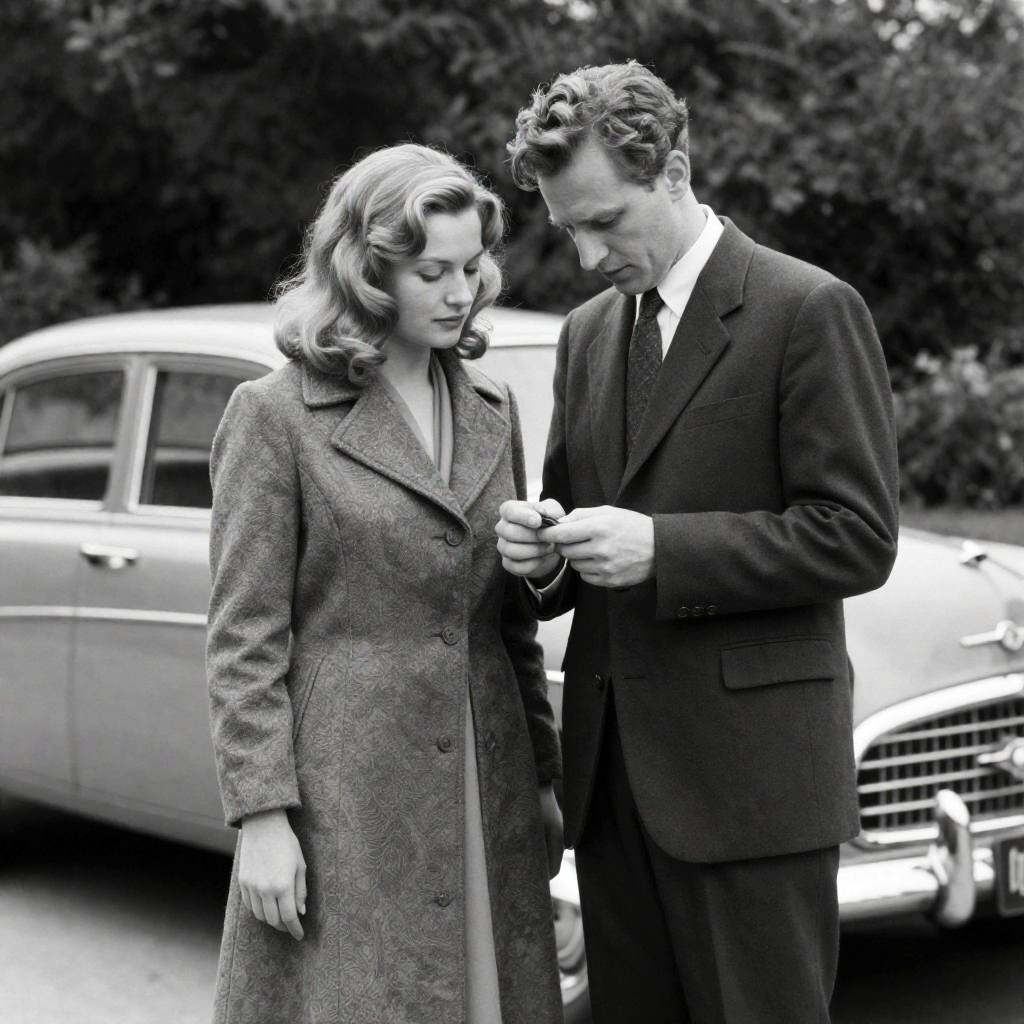 Black-and-white photograph of a man and woman outdoors. The woman, with wavy blonde hair, wears a patterned coat and light dress, looking down. The man, with wavy hair, wears a dark suit and tie, holding a small object near her hand. A vintage car is in the background, with trees and shrubs surrounding them. The man is slightly behind and to the right of the woman, leaning towards her.