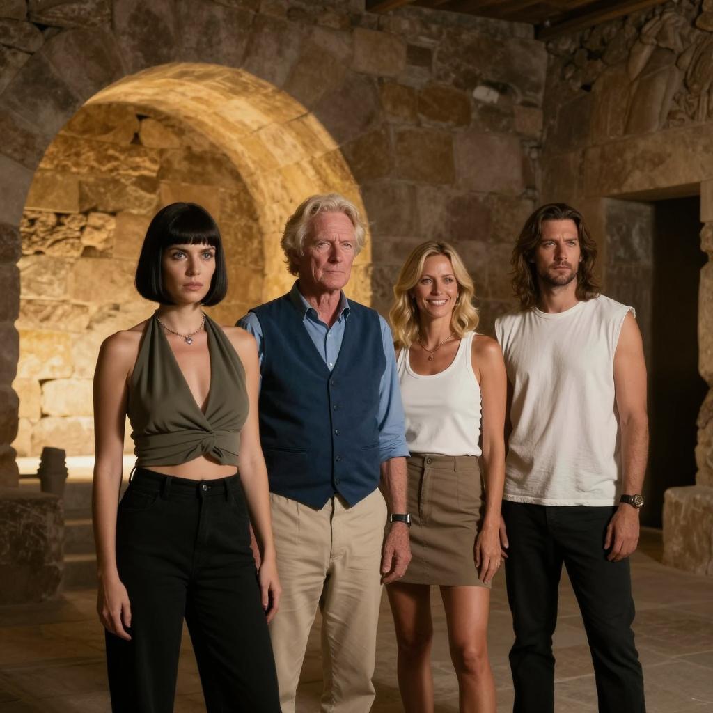 Photograph of three people in an indoor setting. Blonde man in black suit stands left, looking serious. Middle-aged man with gray hair and beard, white shirt, and beige pants sits on stairs, leaning forward. Woman with long black hair, brown top, and black pants kneels on floor, looking up at seated man. Wooden staircase and yellow walls in background. Camera equipment on chair to left. Intense expressions.