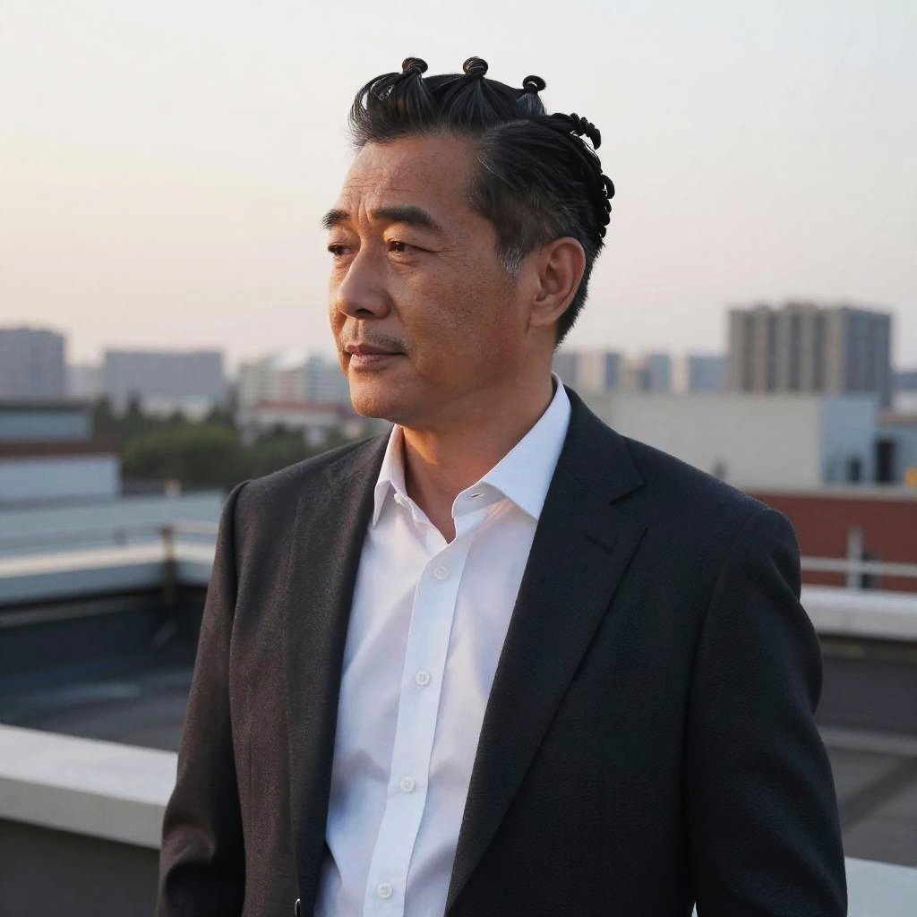 Mini Twists hairstyle on middle-aged man, wearing business casual suit, in urban rooftop at dusk, captured in fashion editorial style with soft twilight glow.