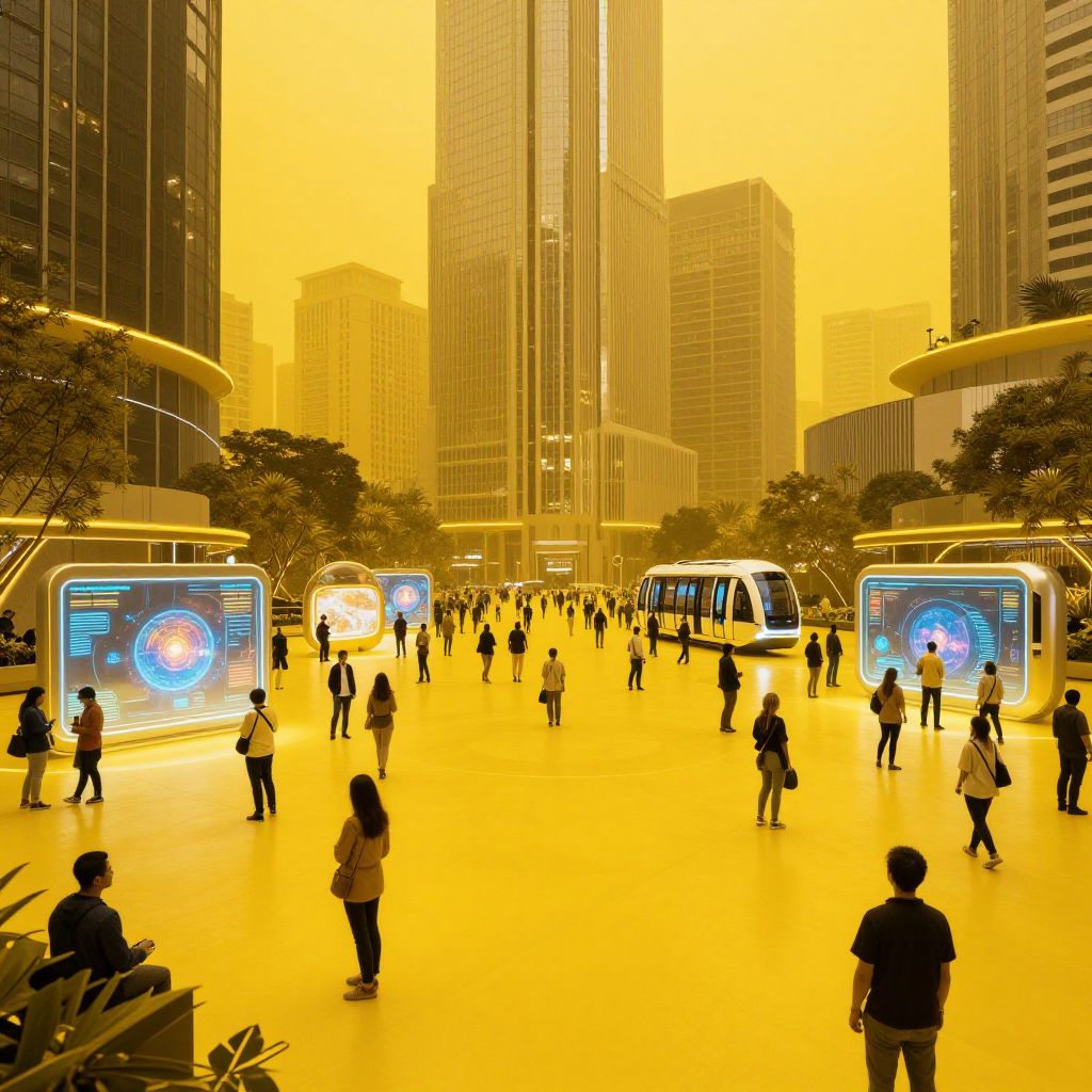 Photograph of a futuristic urban plaza bathed in golden-yellow light, with people walking around, tall skyscrapers, and large digital screens displaying blue