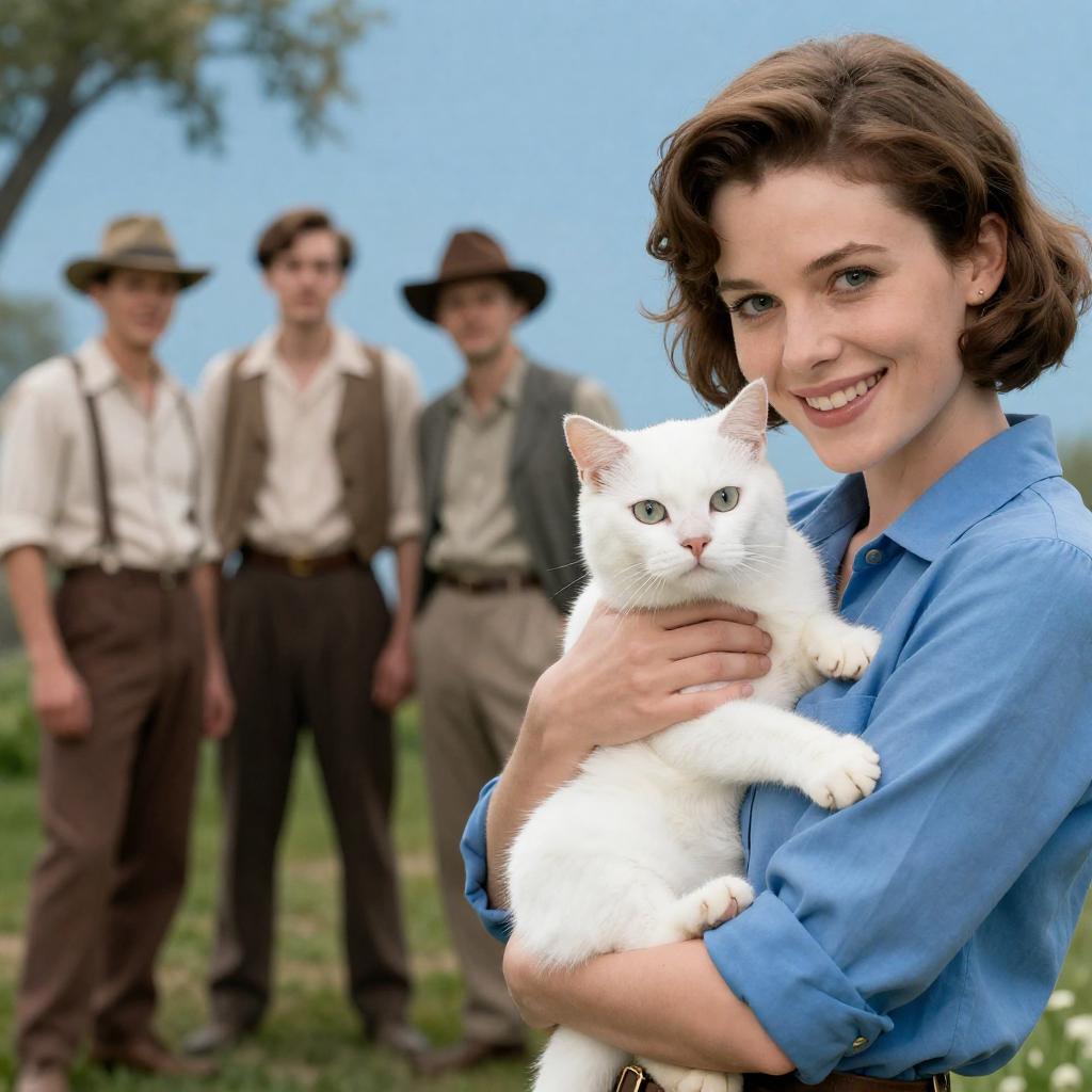 Photograph of a movie poster. Right side: woman with short brown hair, wearing a blue shirt, holding a white cat, smiling. Left side: three men in vintage clothing, standing in a grassy area with trees. Blue background.