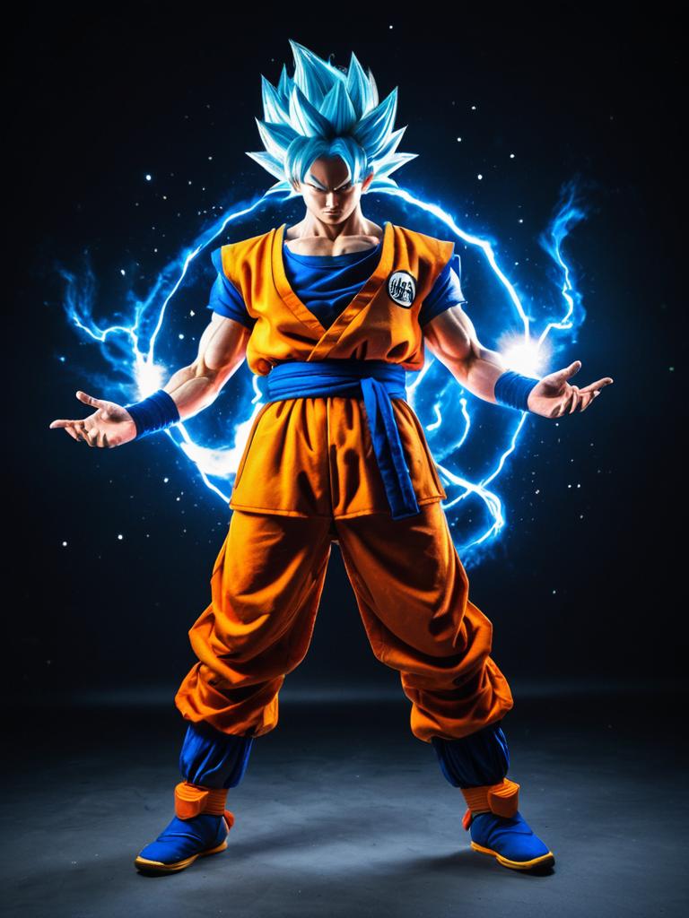 Man in Goku Super Saiyan Costume, full-body cosplay photo with glowing aura