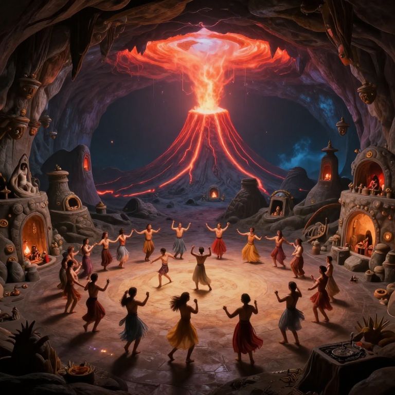 Digital fantasy artwork of dancing women in colorful dresses around a glowing volcano in a cavern, with lit huts and mystical ambiance.