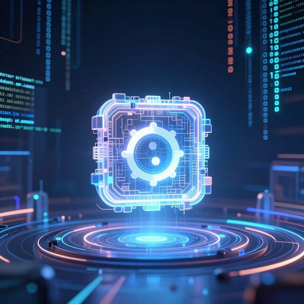 CGI digital art of a glowing blue circuit with a central gear, floating above a neon-ringed platform in a futuristic, dark blue, tech-filled