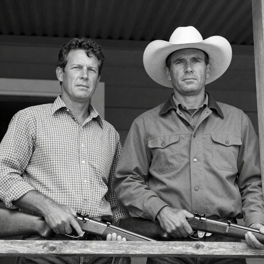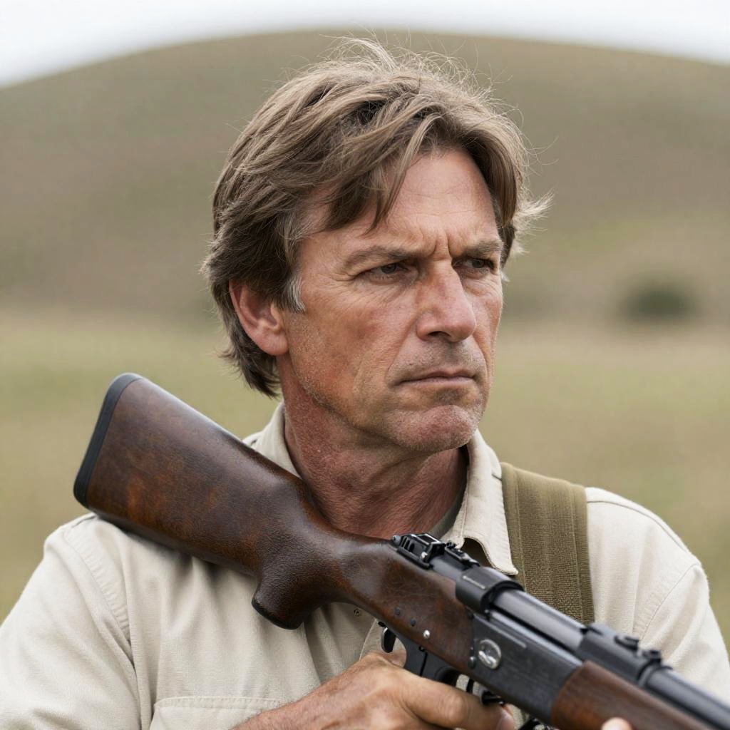 Black-and-white photograph of a middle-aged man with short hair and a serious expression, holding a large mounted machine gun. He is wearing a dusty, open-collared shirt with rolled-up sleeves. The background shows a rocky, arid landscape with scattered clouds.