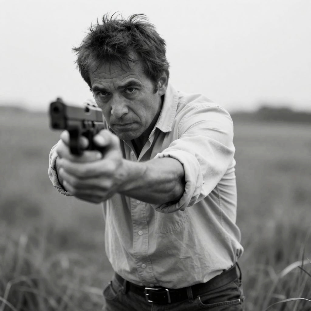 Black-and-white photograph of a middle-aged man with short, dark hair and a serious expression, holding a large, mounted machine gun. He wears a dusty, open-collared shirt. Rocky, arid landscape with scattered clouds in the background. Man is positioned to the right, machine gun in front.