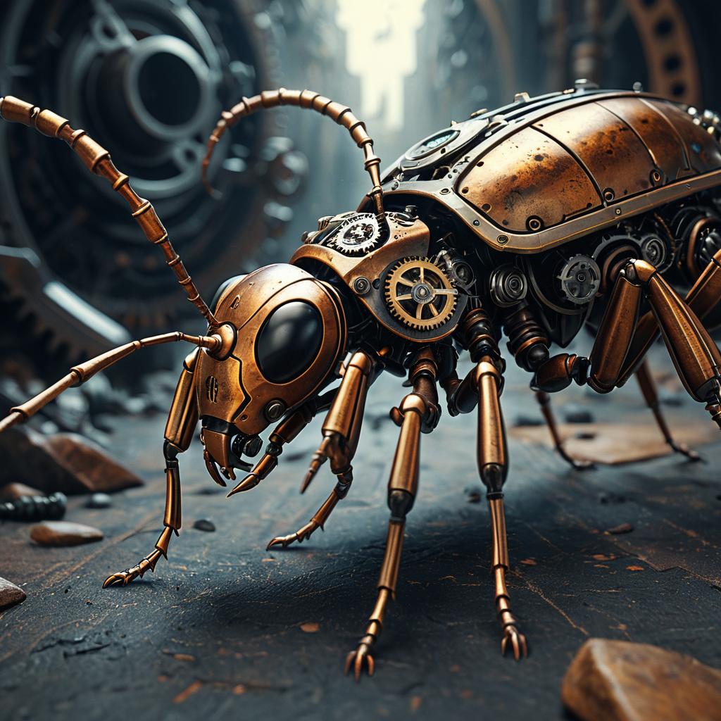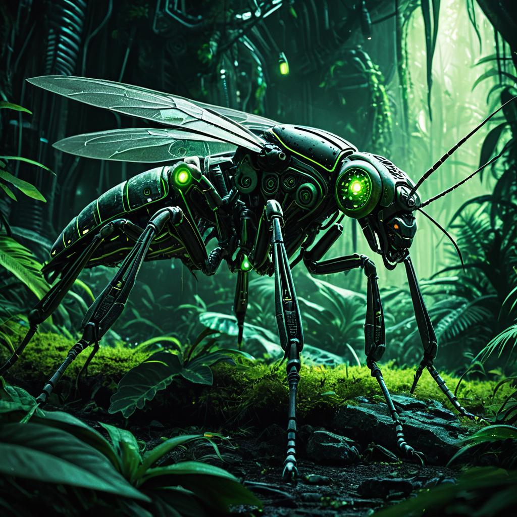 Detailed concept art of a biomechanical insect, rugged design, glowing green lights, set against an alien jungle, high-tech and dramatic.