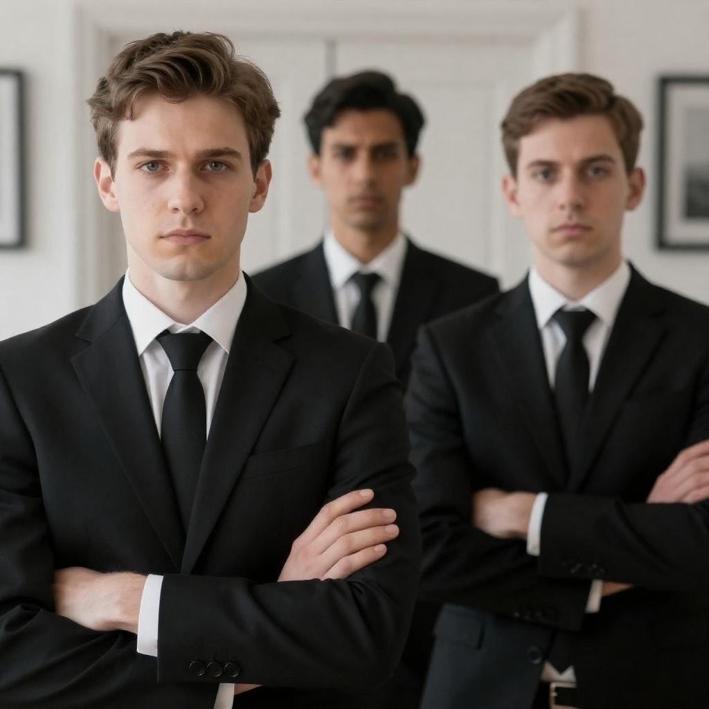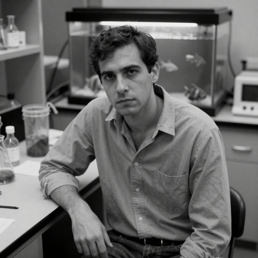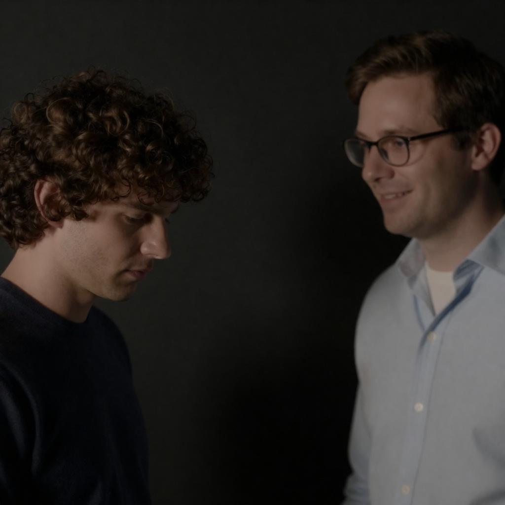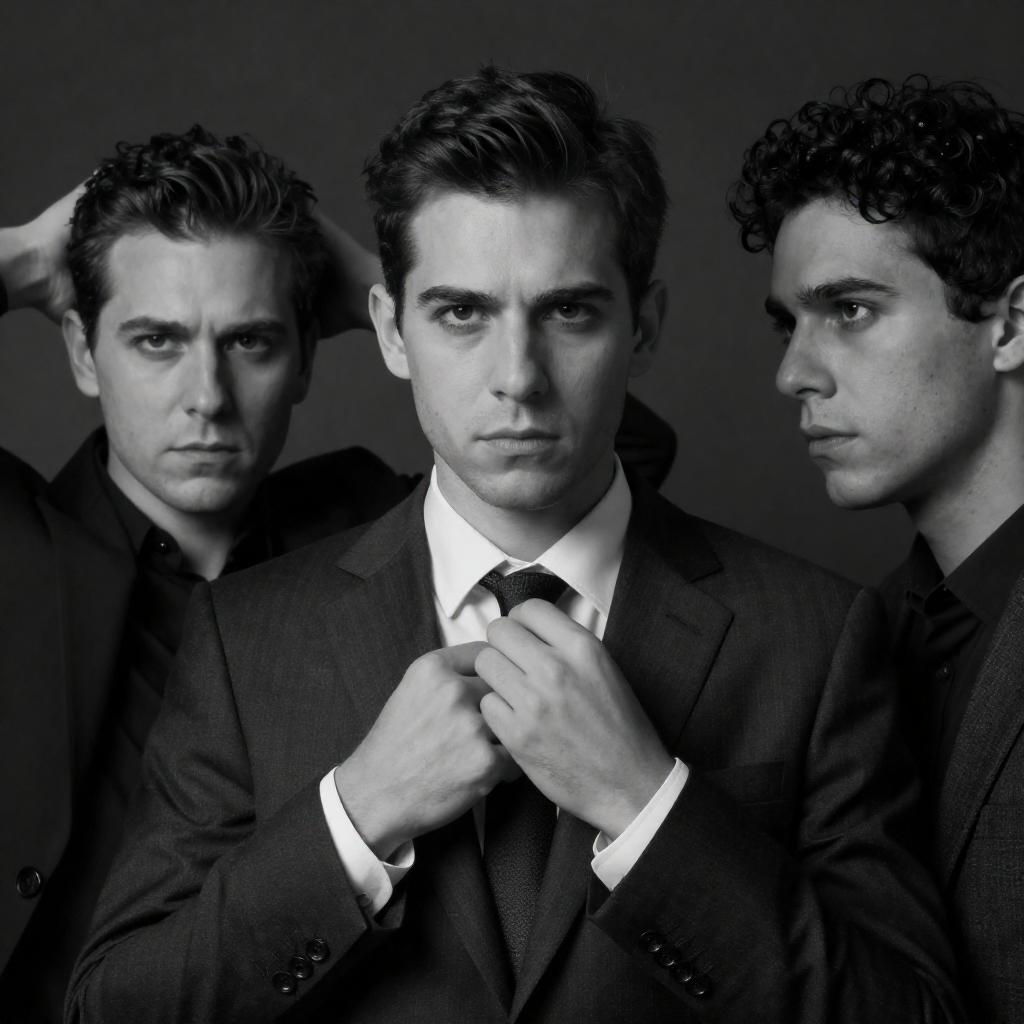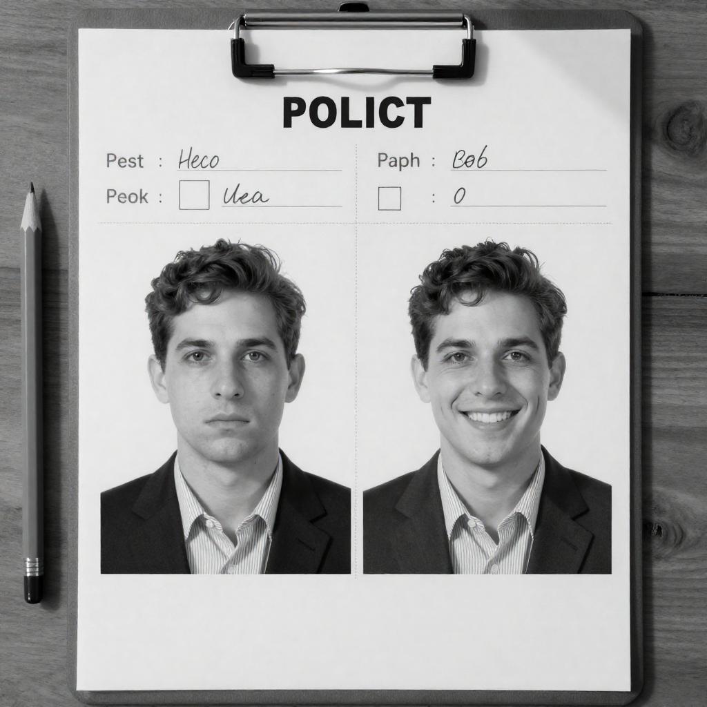 Black-and-white photograph of a man's police file on a wooden surface. File contains two identical headshots of the man with short, wavy hair, wearing a striped shirt and suit. Headshots show a serious expression on the left and a smiling expression on the right. File has handwritten notes and checkboxes. Pencil lies next to the file. Man has fair skin, medium build. Shadow of a person is visible in the top right corner.