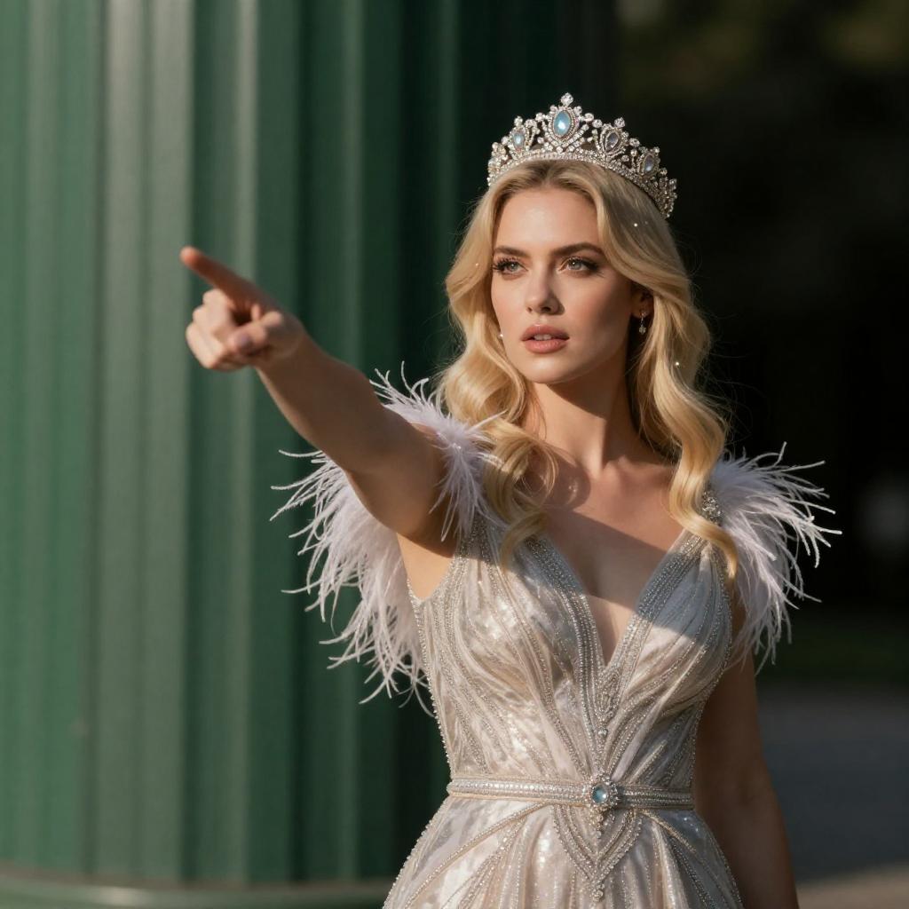 Blonde woman in a shimmering silver dress with feathered shoulders and intricate patterns, wearing a jeweled crown. She points forward with her right hand, sunlight illuminating her left. Green, vertical-striped background. Her expression is intense, focused. Dark, blurred background.