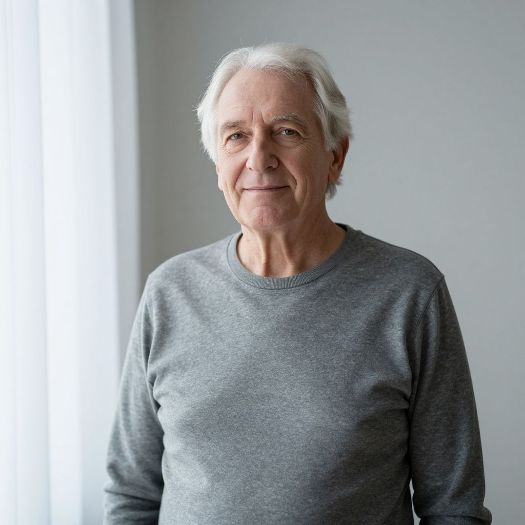 Elderly man with white hair and a mustache wearing a brown apron and a beige shirt.