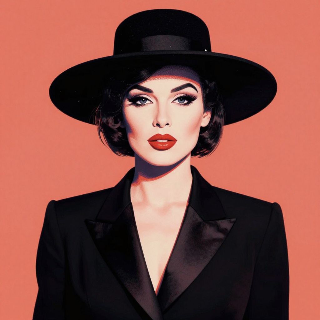 A vibrant pop art illustration reminiscent of Andy Warhol's style, featuring a woman in a sleek black suit and wide-brimmed hat, set against a bold coral background with a retro, high-definition aesthetic.