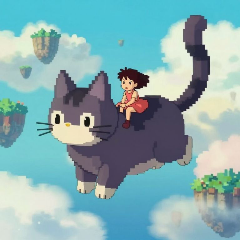 Ghibli pixel art depicting a young girl flying on the back of a giant cat in a mystical sky full of floating islands and soft clouds, pixelated animation style that blends fantasy and adventure influenced by Studio Ghibli's storytelling.