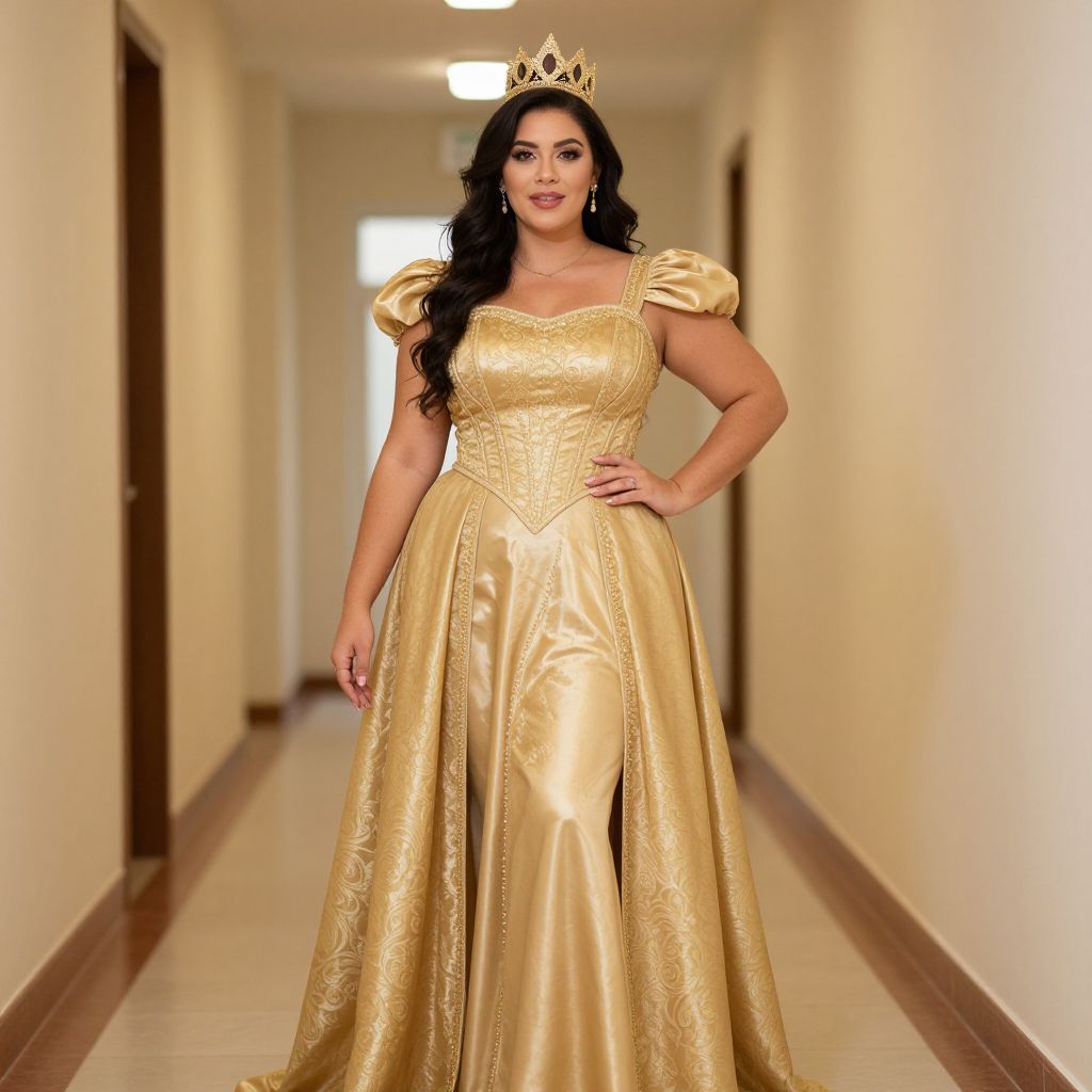 Photograph of a Latina woman with long black hair, wearing a golden, satin, puffed-sleeve gown and gold crown, standing confidently in