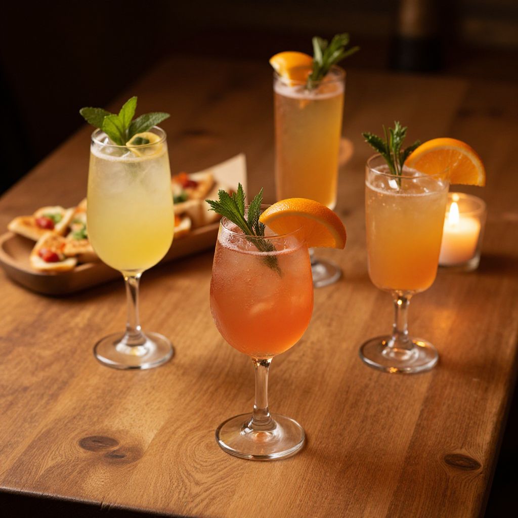 Apéritif setting on a rustic wooden table, featuring elegant glasses filled with colorful cocktails, garnished with fresh herbs and citrus slices, soft warm lighting creating a cozy, inviting atmosphere, with subtle background of light appetizers and candles.