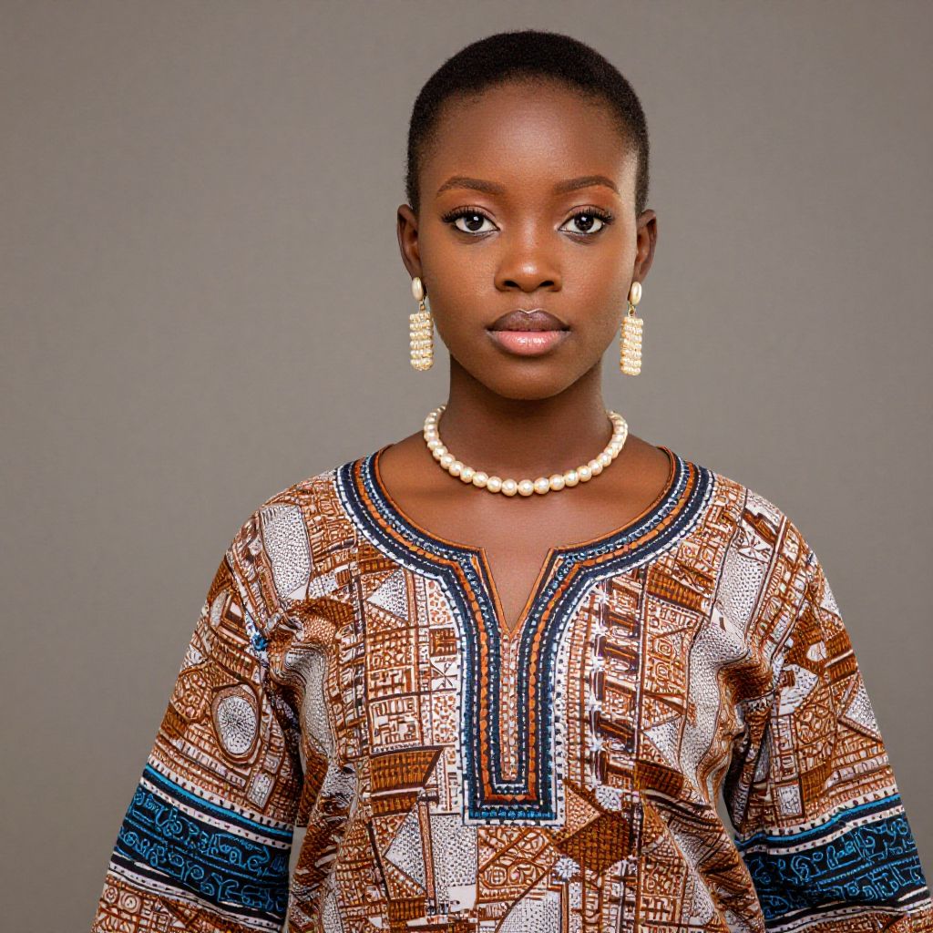 Woman with braided updo hairstyle, culturally inspired elegance, deep mahogany braids with woven beads, traditional African jewelry, flowing cotton kente dress, posing in a courtyard with palm trees, soft morning light, respectful and dignified posture, celebration of identity and heritage.