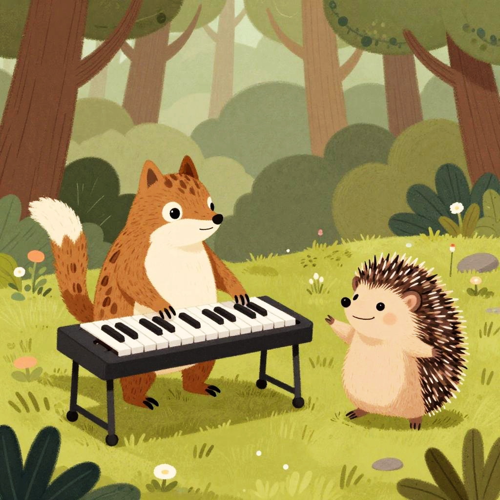 Chipmunk playing a glockenspiel and hedgehog swaying gently in a whimsical forest setting, playful and musical, illustrated in a charming style