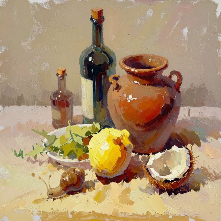 The image is a still life painting that captures a rustic scene with a focus on texture and form. The artwork is created using oil paint on canvas, characterized by thick brushstrokes and expressive mark-making that build up layers of color and texture. The composition features a variety of objects, including a tall, dark green bottle with a cork stopper, a smaller corked bottle, a large brown ceramic pot, a yellow ceramic bowl filled with green leaves, a lemon, a snail, and a broken coconut. The objects are arranged in a balanced manner, with the bottle and pot serving as central focal points, flanked by the other elements. The interplay of colors is rich and varied, with the dark green bottle contrasting against the warm tones of the ceramic pot and bowl. The textures are vividly depicted, from the smooth surface of the bottle to the rough, cracked texture of the ceramic pot. The overall composition is harmonious, with the objects arranged in a way that creates a sense of depth and spatial relationships, inviting the viewer to explore the intricate details and interconnections within the scene.