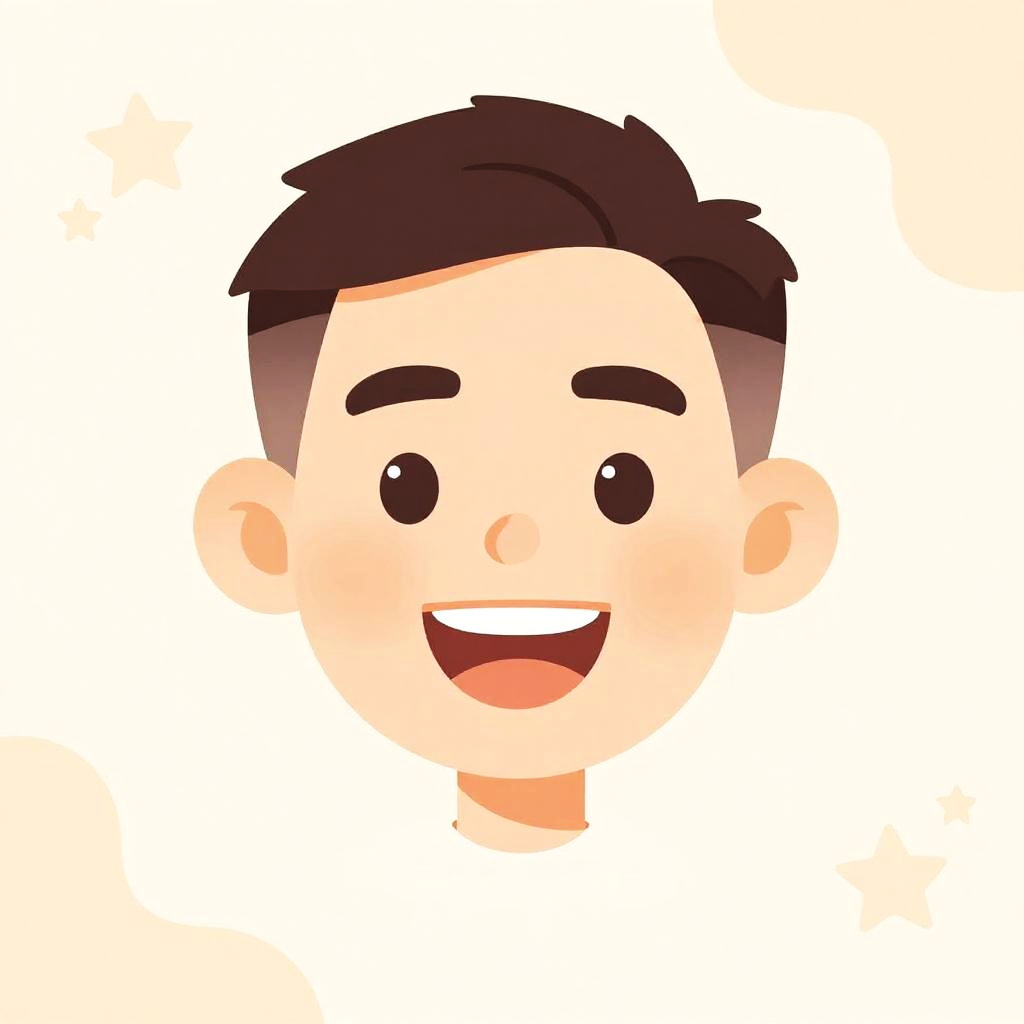 Digital cartoon of a smiling young man with black hair, blue jacket, pink shirt, against a colorful yellow, pink, and blue starburst background.