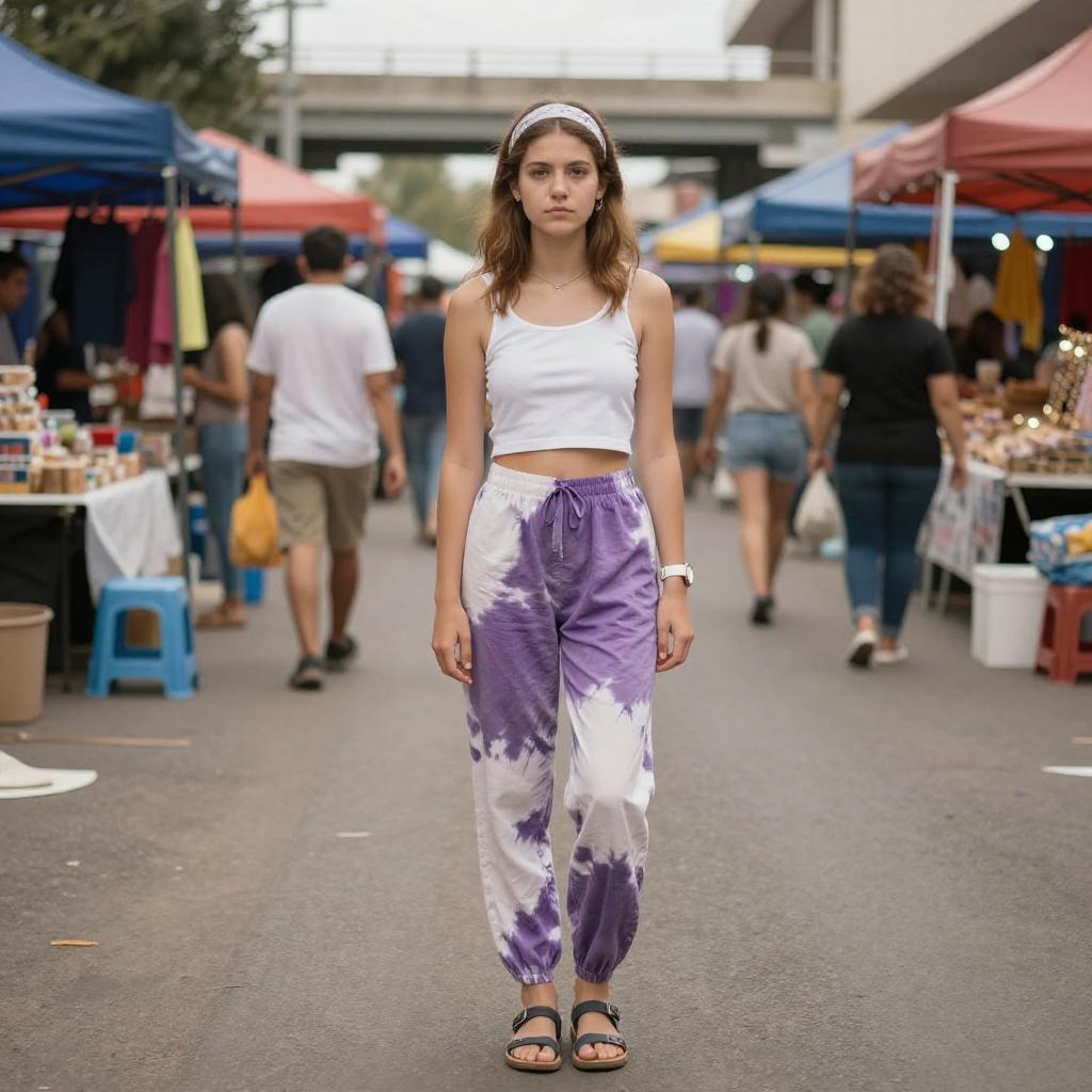 Photograph of a young woman standing in a bustling outdoor market. She has light brown hair, a serious expression, and wears a white tank top showing a hint of her midriff, paired with tie-dye purple and white pants, and sandals. She's also got a headband and a watch. The background is filled with market stalls, people, and colorful tents under an overpass.
