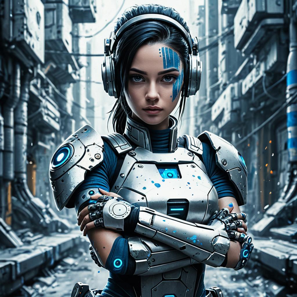 Portrait of a futuristic cyborg girl with metallic silver and blue cybernetic arm sleeves and armor. She has large expressive eyes, dark hair, and traditional bandages across the chest area. The character is posed with crossed arms in an industrial, sci-fi urban environment with artistic paint splashes and textured details.