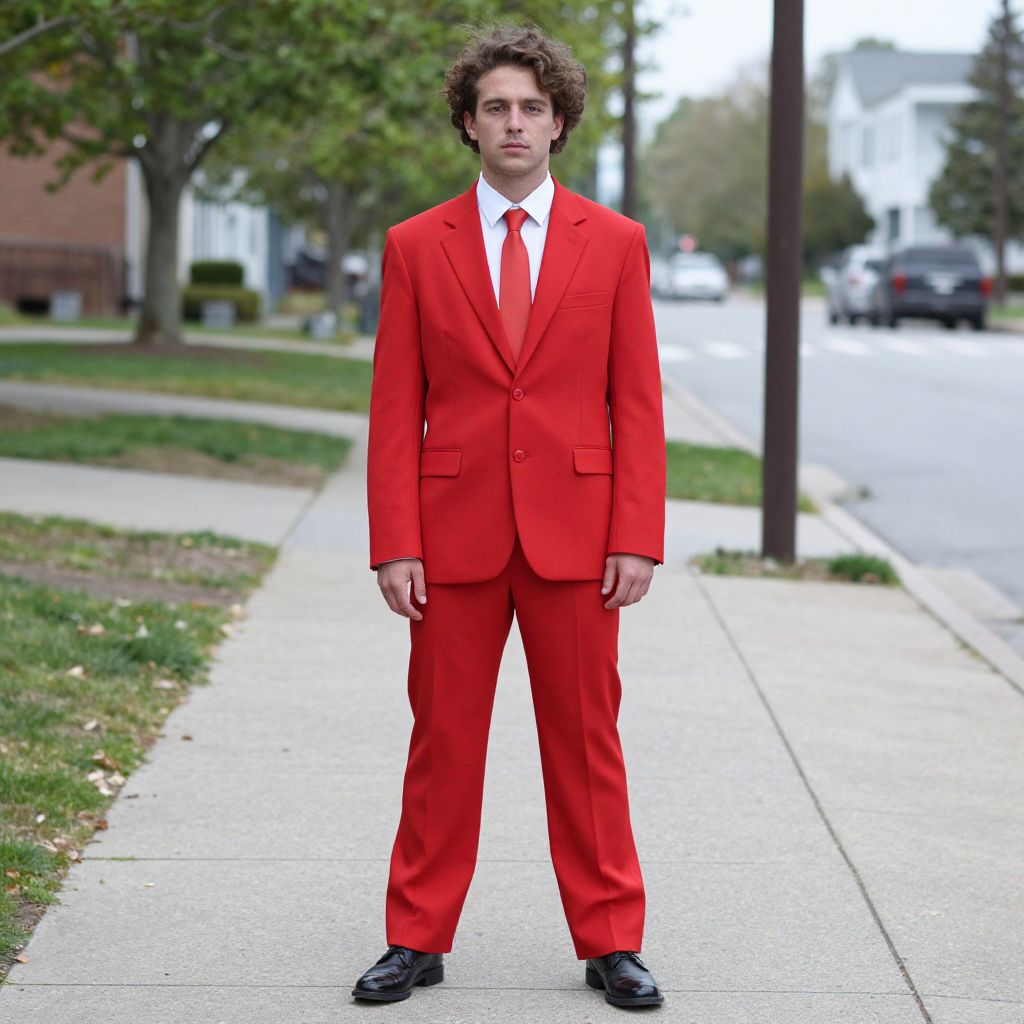 Red Crayola Costume, in a red suit standing on a sidewalk