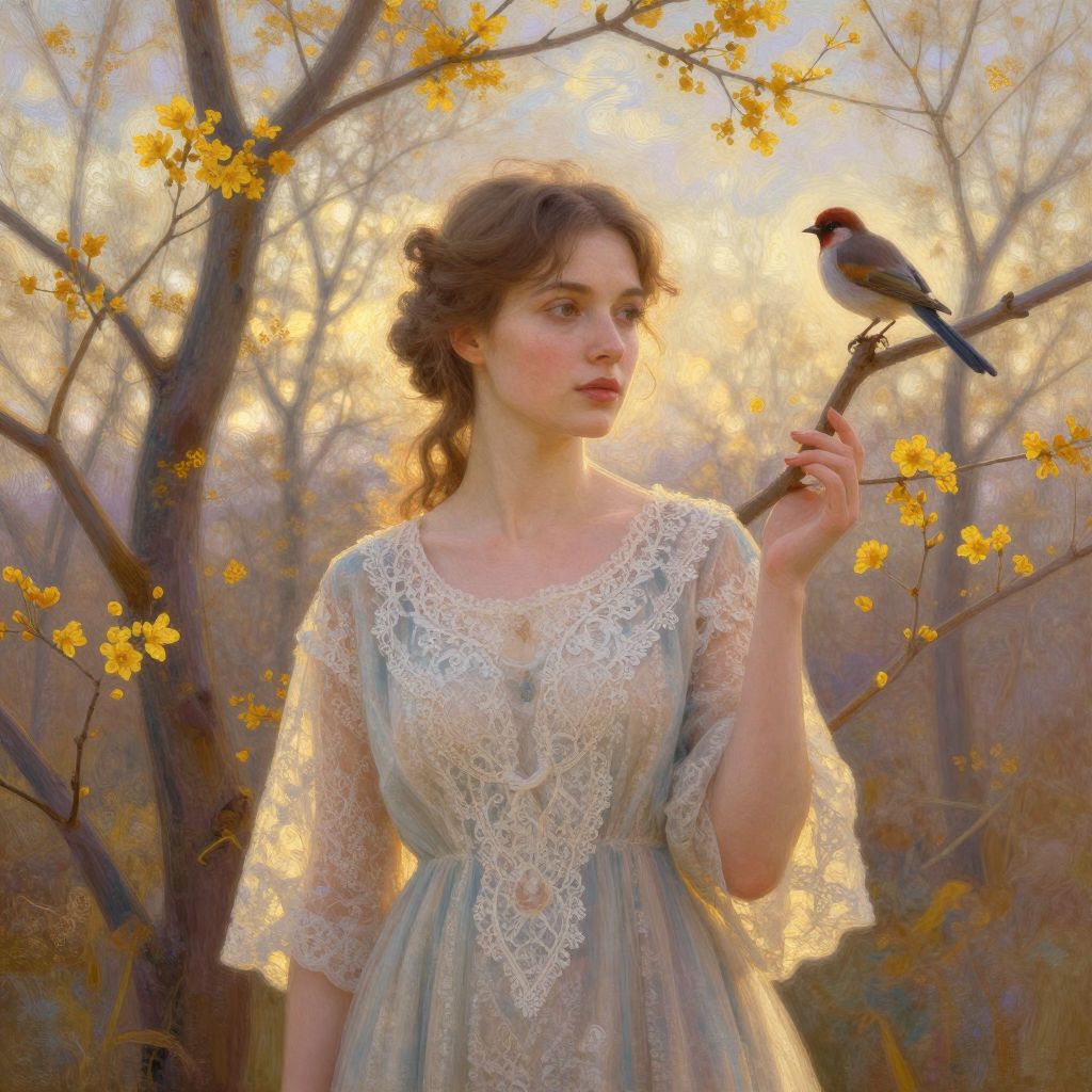 A Russian Impressionist-inspired digital artwork by an artist reminiscent of Yuriy Krотов, featuring a serene portrait of a woman in a delicate lace dress, set against a dreamlike backdrop of bare trees adorned with golden flowers and a whimsical bird perched on a branch, bathed in the warm, ethereal glow of golden hour lighting.