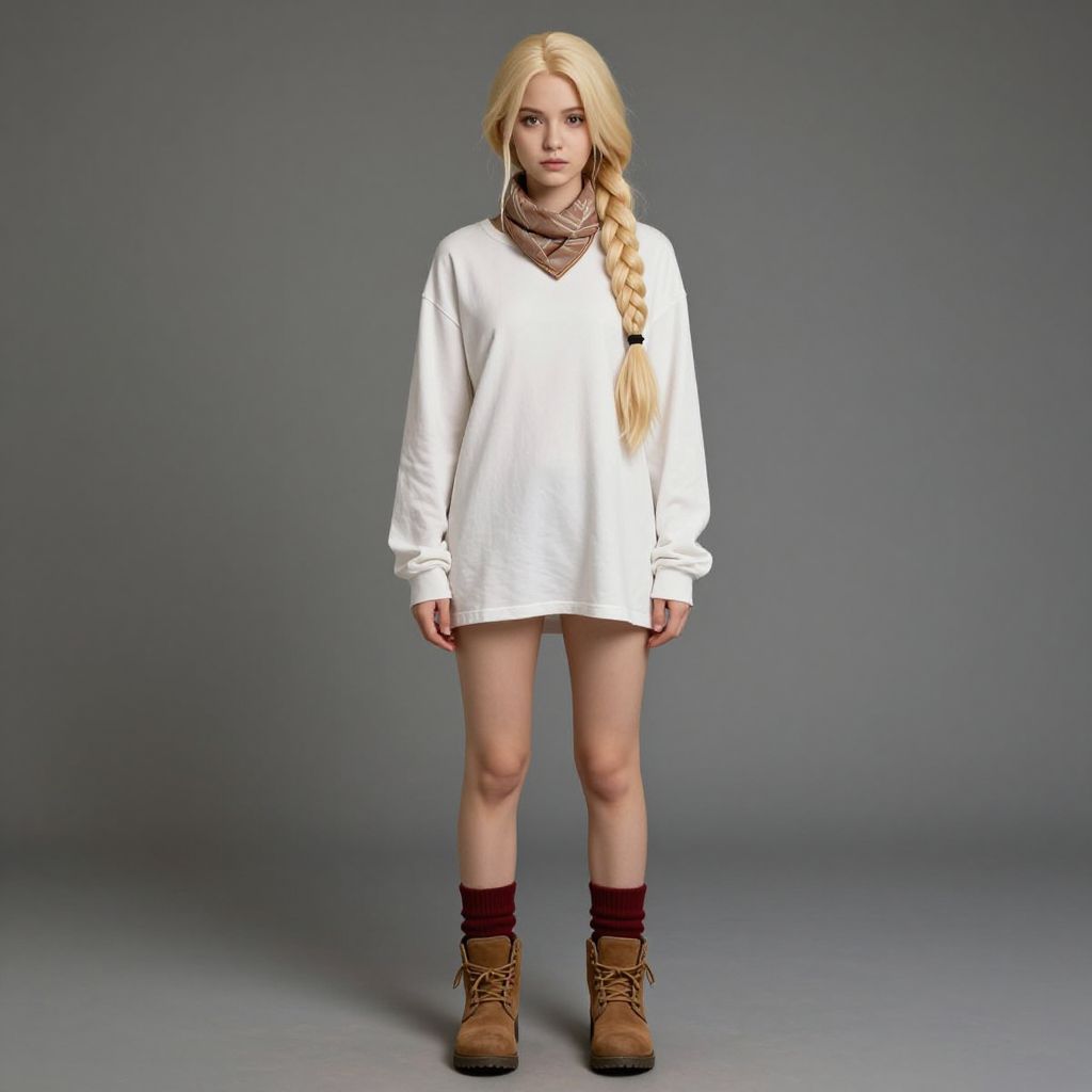 Photograph of a young woman with long, straight, platinum blonde hair in a loose braid. She wears a loose-fitting, white oversized sweater that ends mid-thigh, revealing her bare legs. She also has a brown, patterned scarf around her neck, burgundy socks, and brown lace-up boots. The background is a plain, gradient gray, with no additional objects. Her expression is neutral, and she stands with her arms relaxed at her sides. The overall style is casual and minimalist.