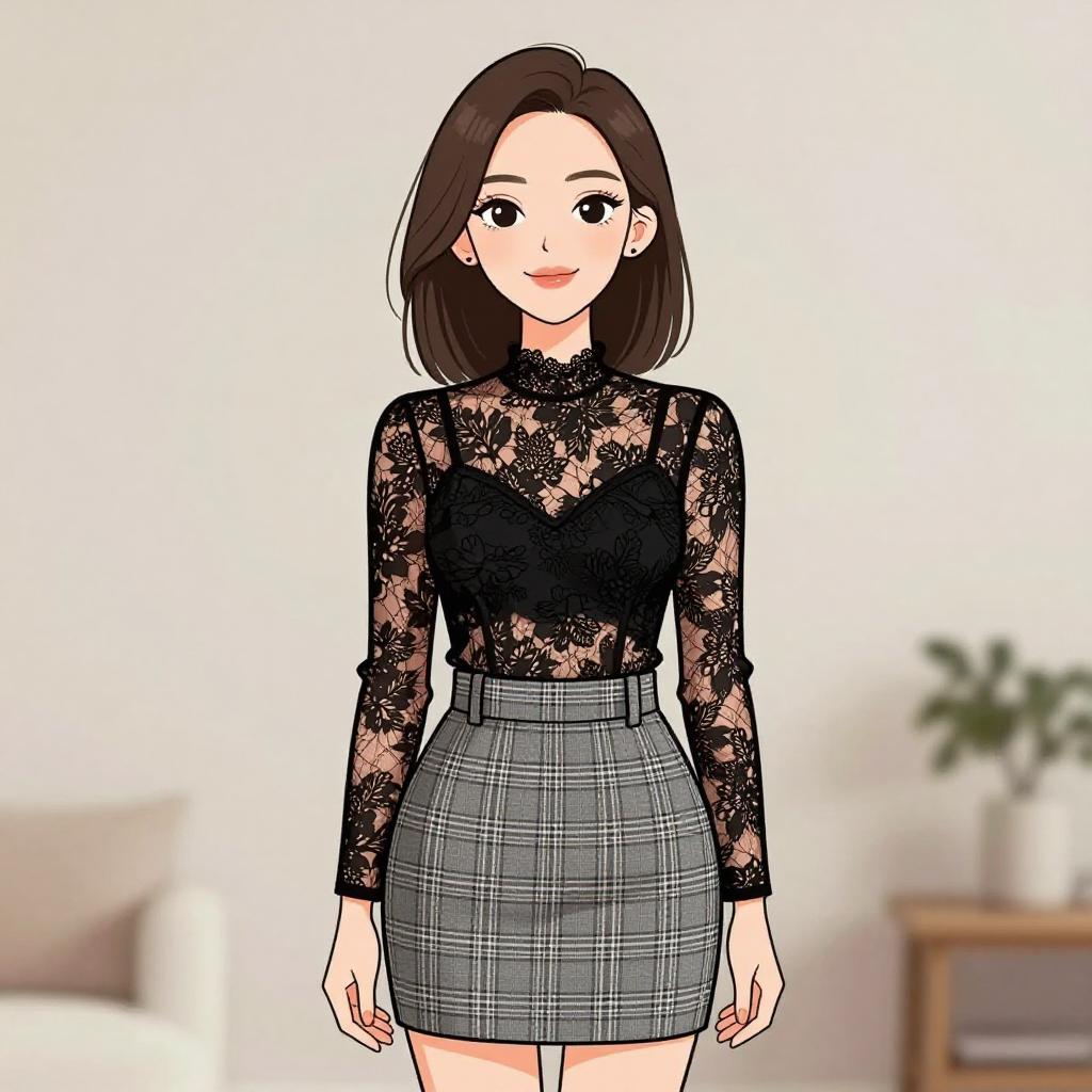 Woman with pretty face and pretty hair. smiling Woman, glamorous style, long-sleeve mini dress with black lace overlay, solid black underlay, high neckline, fitted silhouette, sheer lace sleeves, back zipper closure. --sref 1467