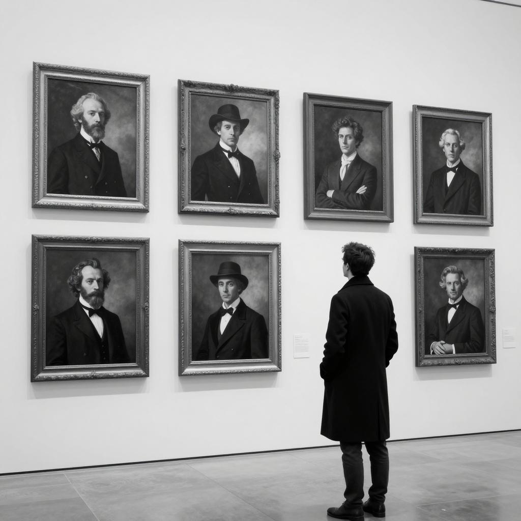 Black and white conceptual artwork featuring a man in a long coat standing in an art gallery, observing multiple vintage-style framed portraits. The portraits depict various people dressed in period clothing, set against classical architectural backgrounds.