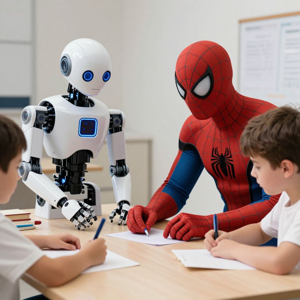 Photograph of a classroom scene: Spider-Man, a white robot, and two boys writing at a desk, bright classroom background.