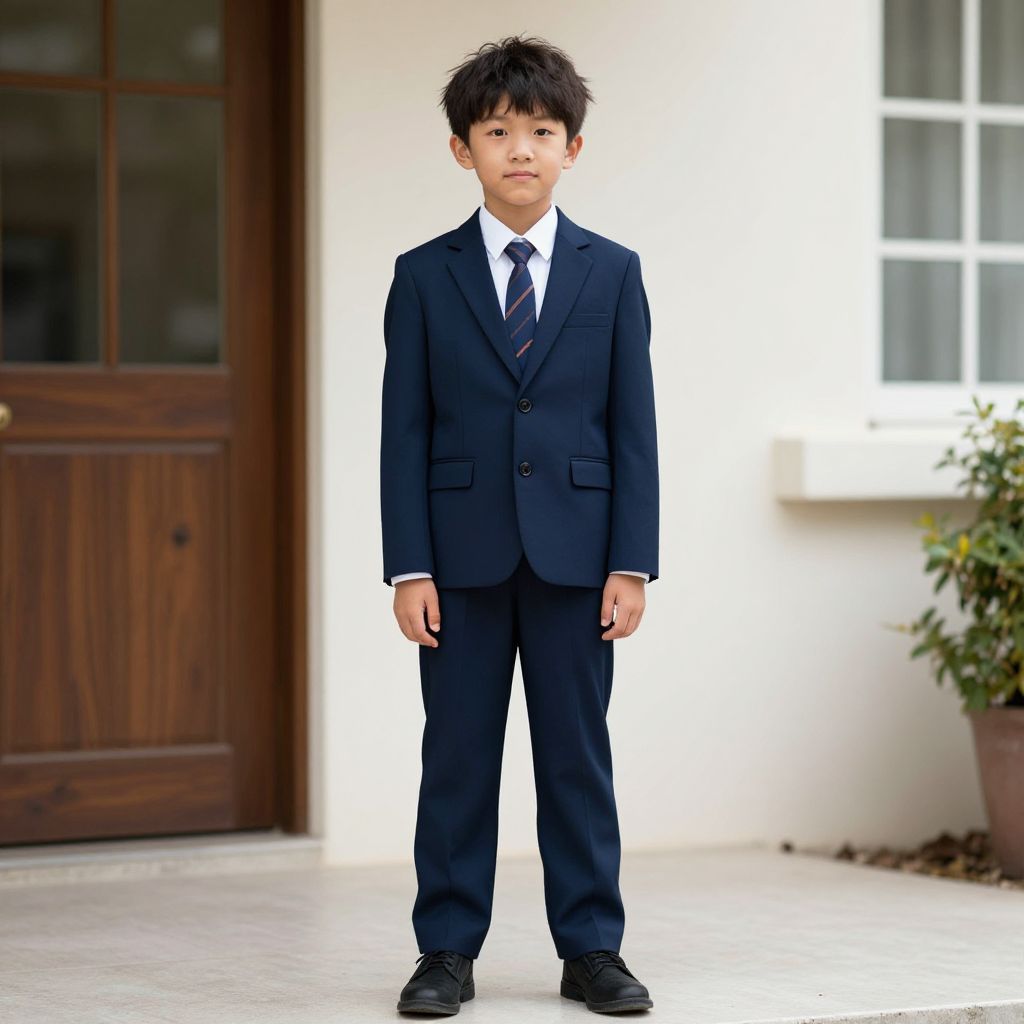 Photograph of an Asian young boy standing in front of a wooden door and white wall. He has short, black, slightly messy hair and a serious expression. He is wearing a dark navy blue, three-piece suit with a white dress shirt and a black tie. His black dress shoes are polished. The door behind him has a glass pane, and to the right, there is a potted plant. The background is bright, with sunlight illuminating the white wall. The boy's small frame and formal attire suggest he may be attending a special event or ceremony.