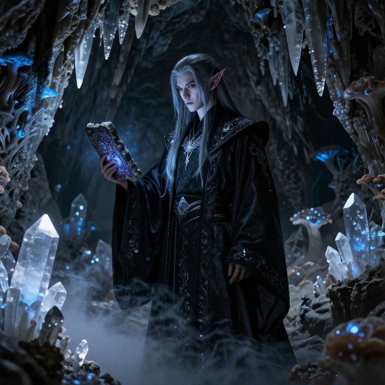 In a hidden underground cavern filled with crystal stalactites and glowing blue fungi, a dark elf with a narrow face, long silver-black hair, and a piercing gaze stands in the center, dressed in flowing robes of black silk with silver embroidery, one hand resting on a stone tablet that pulses with dark magic, the air thick with ethereal mist.