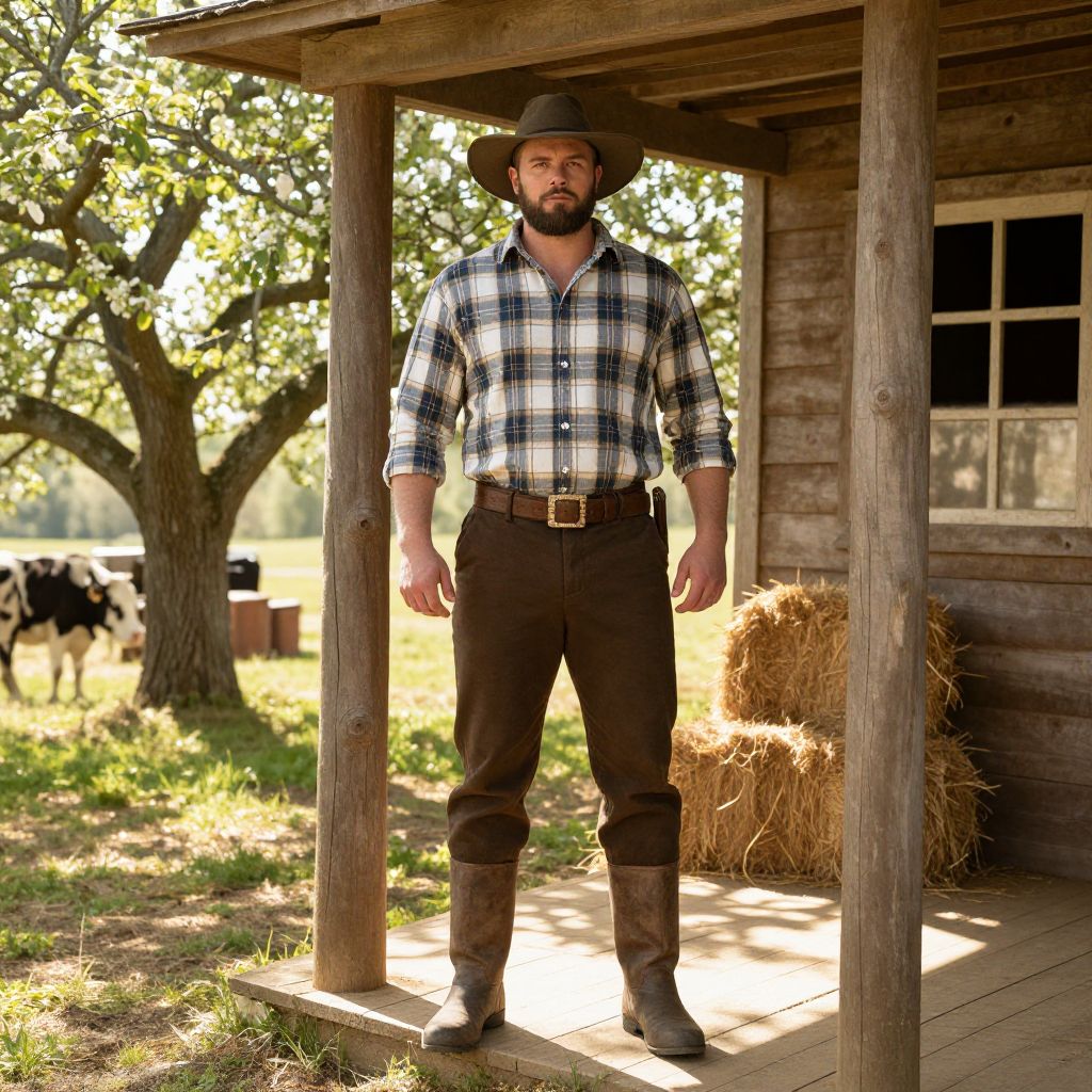 A tall, fit man with a beard and deep brown hair dressed in a traditional outdoor country costume—boots, plaid shirt, and a wide-brimmed hat—standing on a wooden porch of a countryside farmhouse, sunlight filtering through apple trees, surrounded by hay bales and farm animals