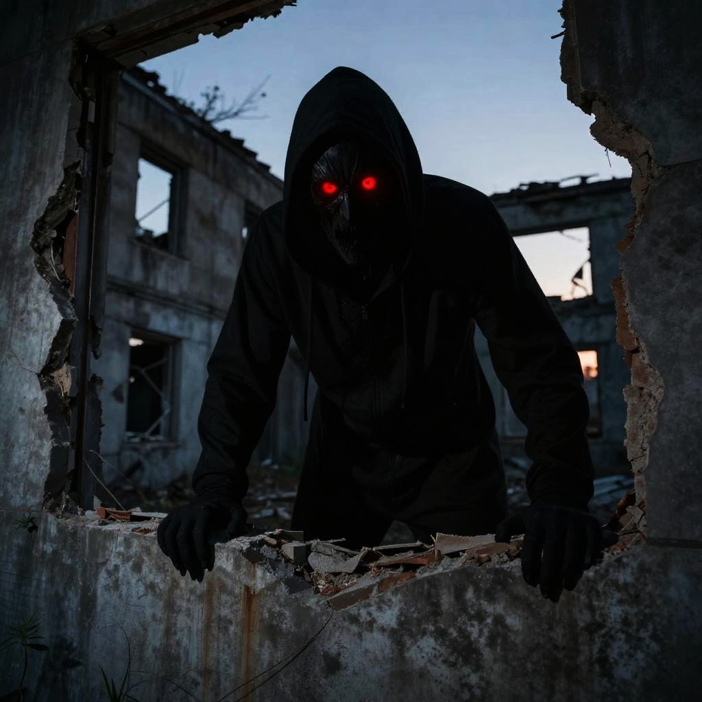 Dark shadowy figure with glowing red eyes wearing a hooded garment is reflected behind a shattered mirror in a dimly lit room. The image captures a haunting, suspenseful atmosphere with detailed textures and deep shadows, evoking a psychological thriller mood.