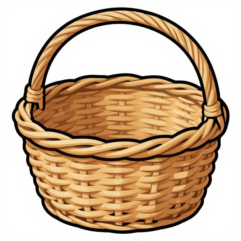 A digital illustration of a woven wicker basket with a curved handle. The basket is light brown with a textured, interlaced pattern, and has a slightly open top. The handle is thick and arcs over the top. The image uses bold black outlines and shading to create a three-dimensional appearance. The background is completely white, making the basket the sole focus. The style is reminiscent of a detailed, colorful cartoon or comic book illustration.