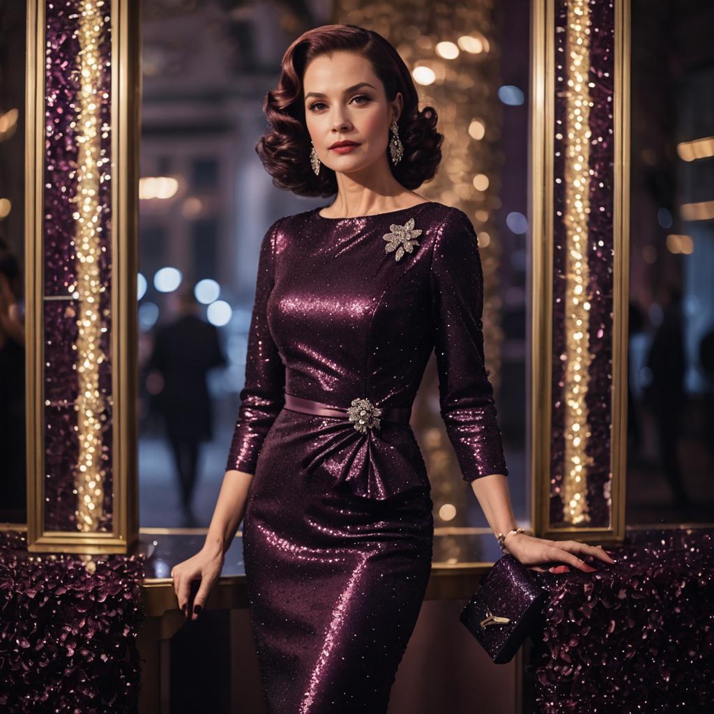 Stylish woman wearing a form-fitting, aubergine-colored sequined dress made of polyester. She features retro curls, bold red lipstick, sparkling statement earrings, and holds a matching evening clutch. The setting suggests an exclusive gala event with dramatic lighting and luxurious decor.