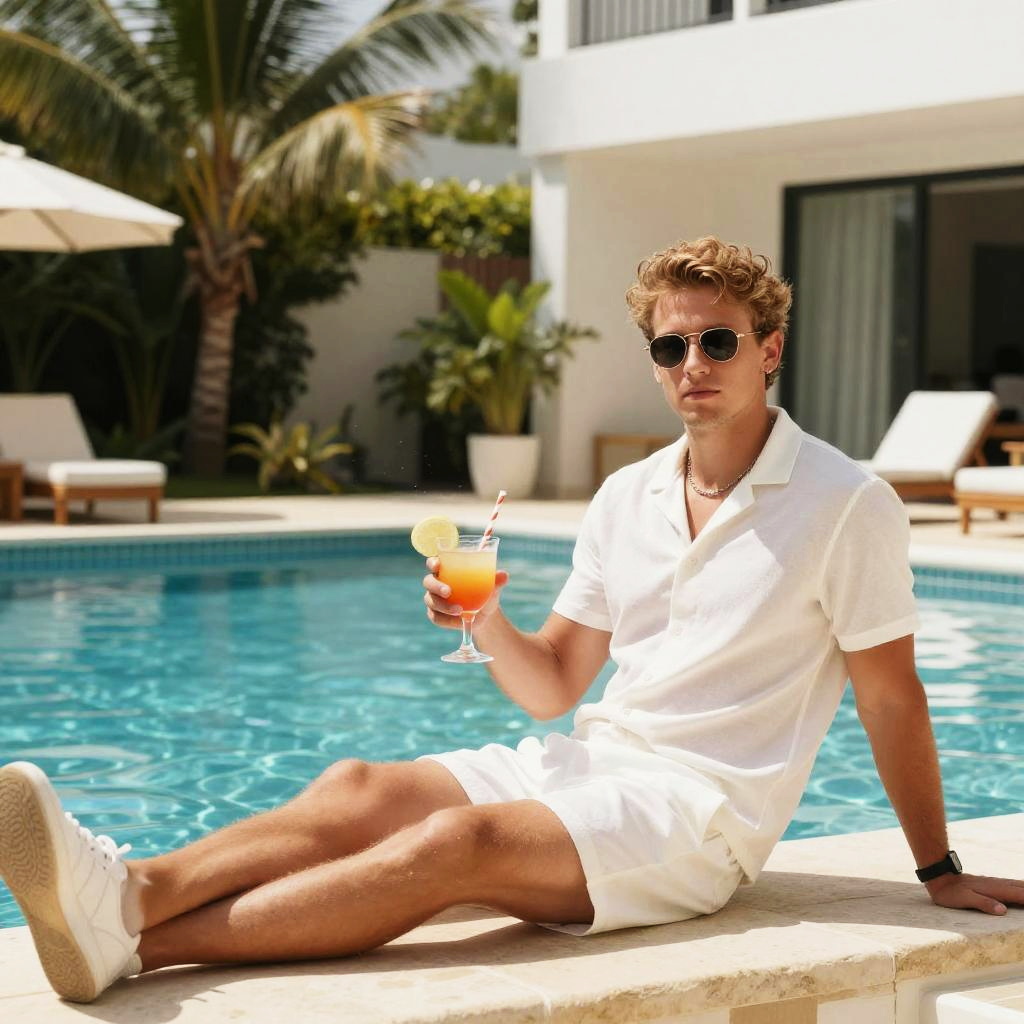 Playboy young gentleman in casual summer outfit, relaxing beside a sparkling pool with elegant cocktails, surrounded by tropical plants and modern architecture, bright and sunny