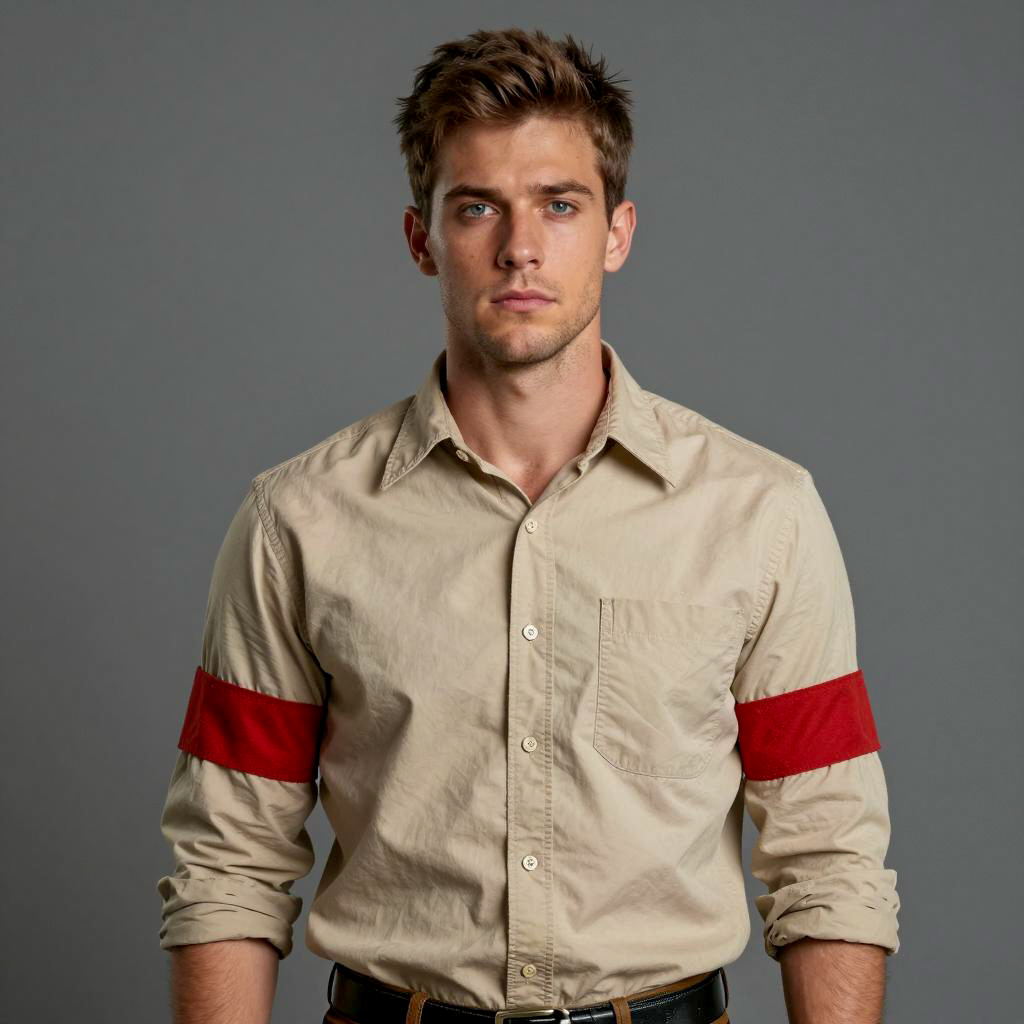 Elf costume shirt, photorealistic portrait, handsome young man, short brown hair, light stubble, serious expression, wearing beige button-up shirt with red armbands, chest pocket, black belt, gray background, studio lighting, realistic ures, slightly worn clothing, front view, subtle shadows, medium close-up, neutral colors