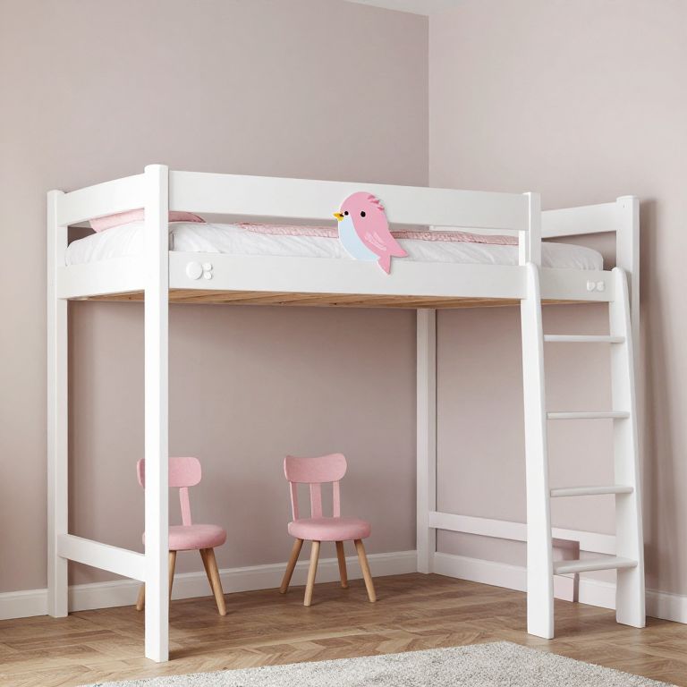 Photograph of a white wooden loft bed with a pink bird sticker, pink chair, and ladder, in a light gray room.