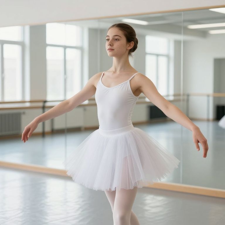 A young female dancer in her early 20s with soft, porcelain skin and subtle freckles stands in a well-lit ballet studio, wearing a classic ballet training outfit consisting of a white leotard with a matching tulle skirt and soft pink ribbed tights. The setting is a clean, mirrored dance studio with natural light streaming through tall windows, reflecting her poised posture and smooth movements in motion.