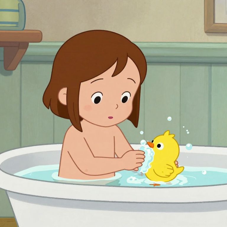 This digital drawing features a young, fair-skinned, brown-haired child with large, round eyes, sitting in a white bathtub filled with clear water. The child is naked, with only their upper body visible above the water. They are holding a bright yellow rubber duck with a small orange beak, which has bubbles around it. The background includes light green wainscoting and a beige wall, with a wooden shelf partially visible on the left. The style is reminiscent of classic, colorful children's cartoons, with smooth, bold lines and simple, vibrant colors.