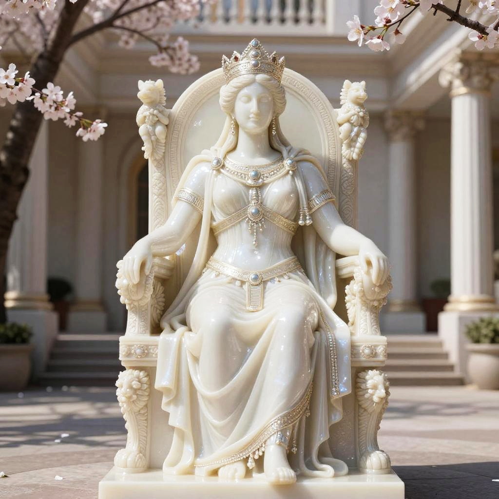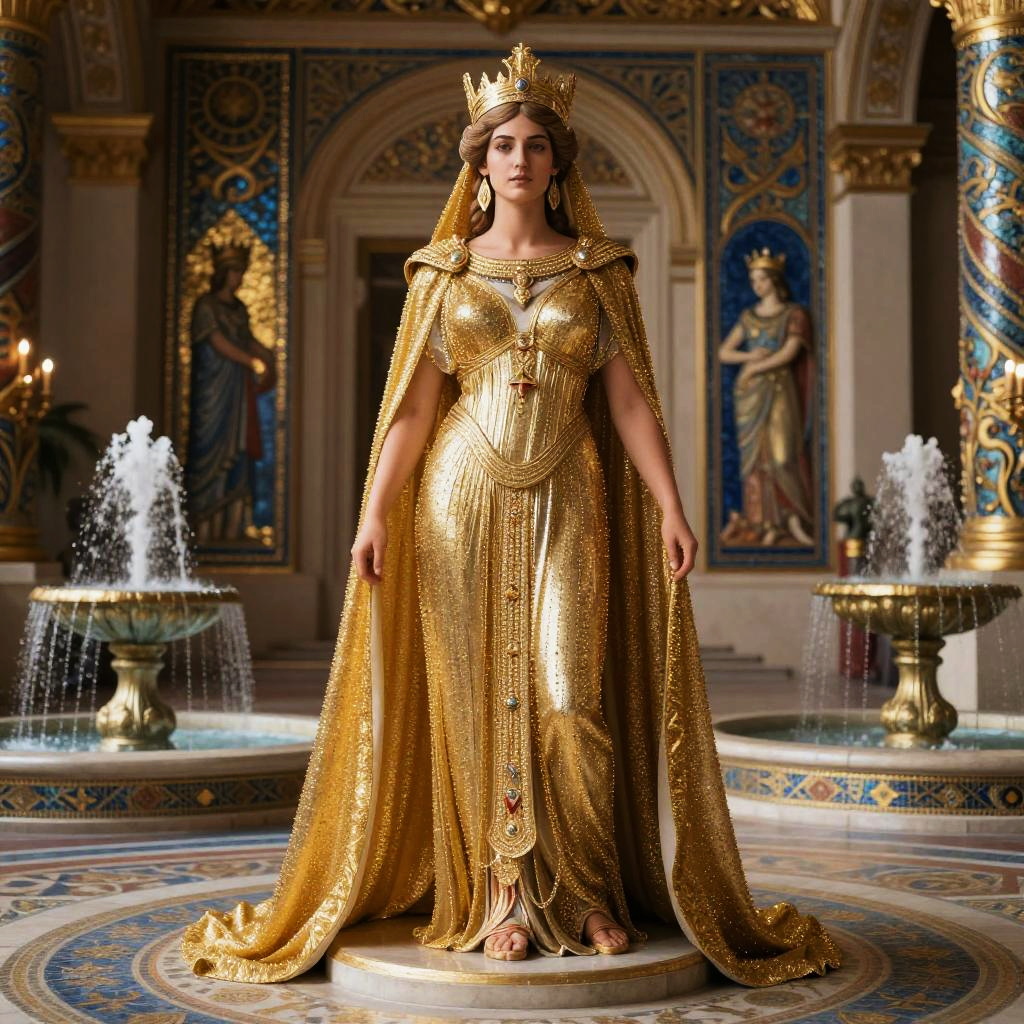 Hera – Queen of the gods, goddess of marriage and family, depicted as a formidable goddess warrior dressed in shimmering purple armor, surrounded by a celestial space with stars swirling around her, echoing her strength.